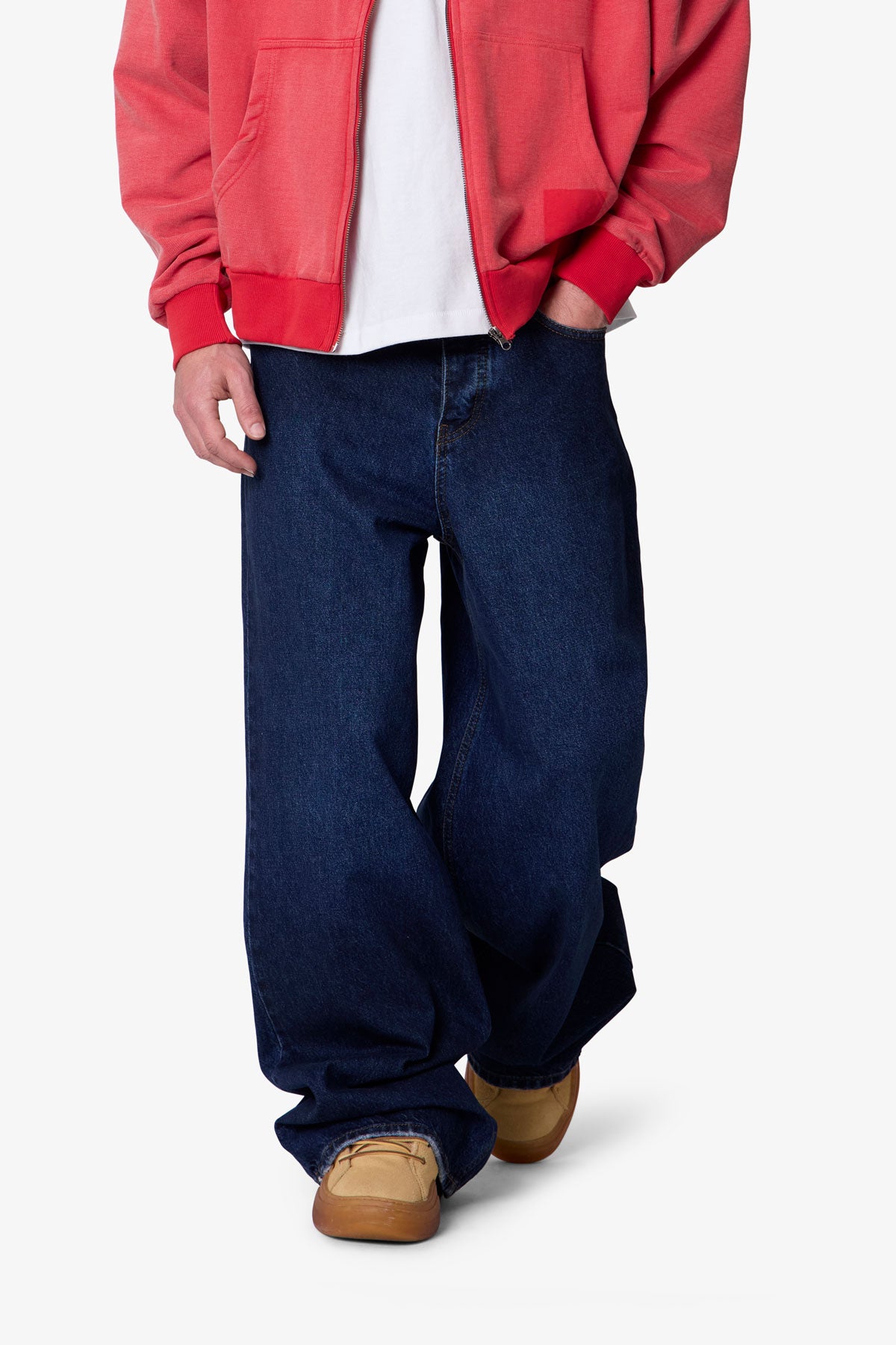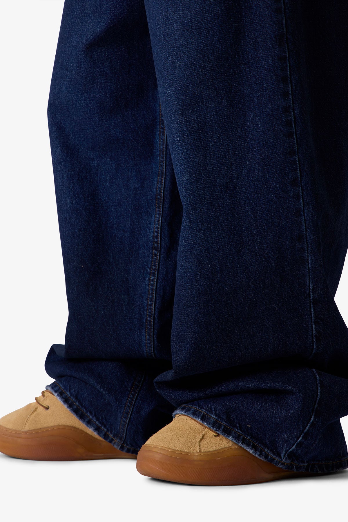 The Baggy Rave Denim is crafted from 100% cotton for a comfortable fit. Designed with a baggy rave silhouette, it features light sanding and subtle distressing at the seams and hems for a worn-in look. The jeans are finished with a standard waistband, five-pocket layout, and a button fly.