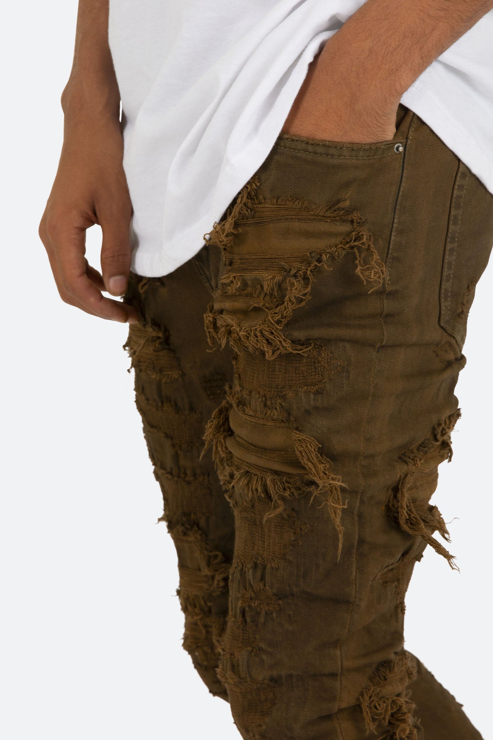 El modelo X289 Stretch Denim está diseñado con nuestro corte X, que es ajustado en toda la prenda, con una entrepierna extendida para facilitar el apilamiento, y presenta un lavado marrón teñido y un acabado con efectos desgastados y reparaciones con la misma tela en toda la prenda.