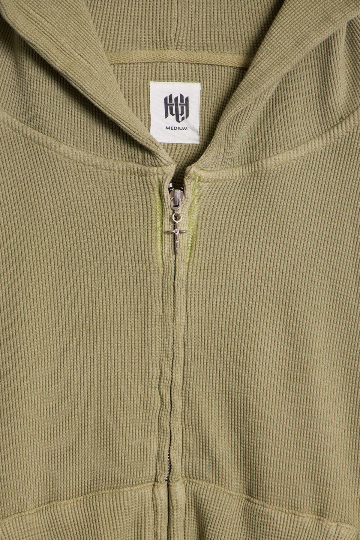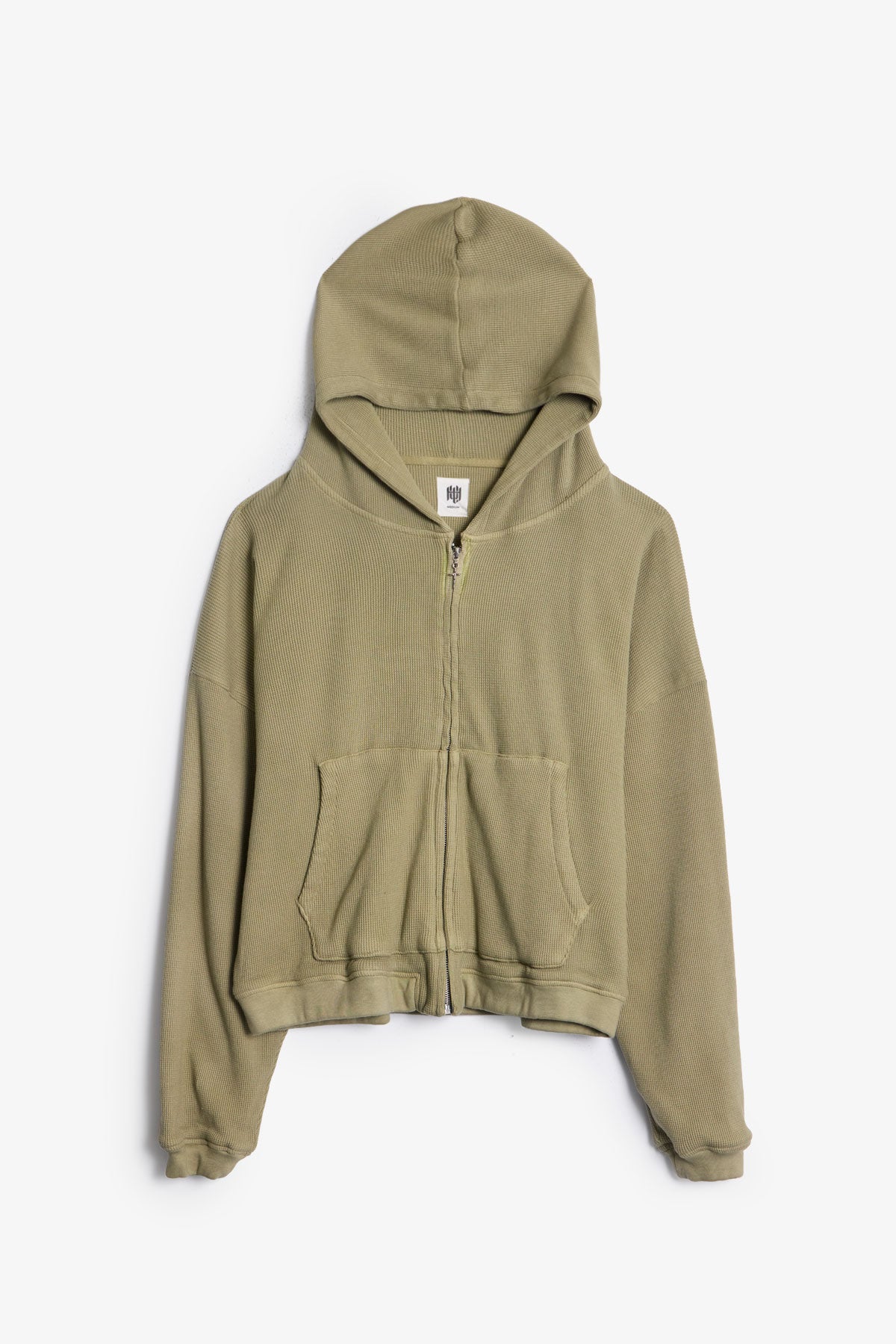 Confeccionada en tejido térmico de doble capa con textura de gofre y un lavado vintage, la sudadera con capucha térmica de doble capa presenta un corte relajado y un estilo ligeramente corto. Diseñada con hombros caídos, amplios bolsillos tipo canguro y acabados acanalados. Cuenta con cierre de cremallera completa, tirador de cremallera personalizado y el logotipo de LWH.