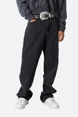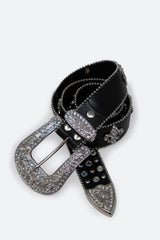 The Fleur Studded Rhinestone Belt is made from black leather and features intricate Western design motifs on the metal buckle, tip and loop, with rhinestone-embellished fleurs-de-lis and pearlescent rhinestones throughout.