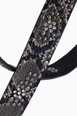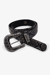 The Python Studded Belt features a faux python texture on 100% leather, detailed with a stud and rhinestone pattern throughout the strap. Finished with an ornate floral buckle encrusted with rhinestones.