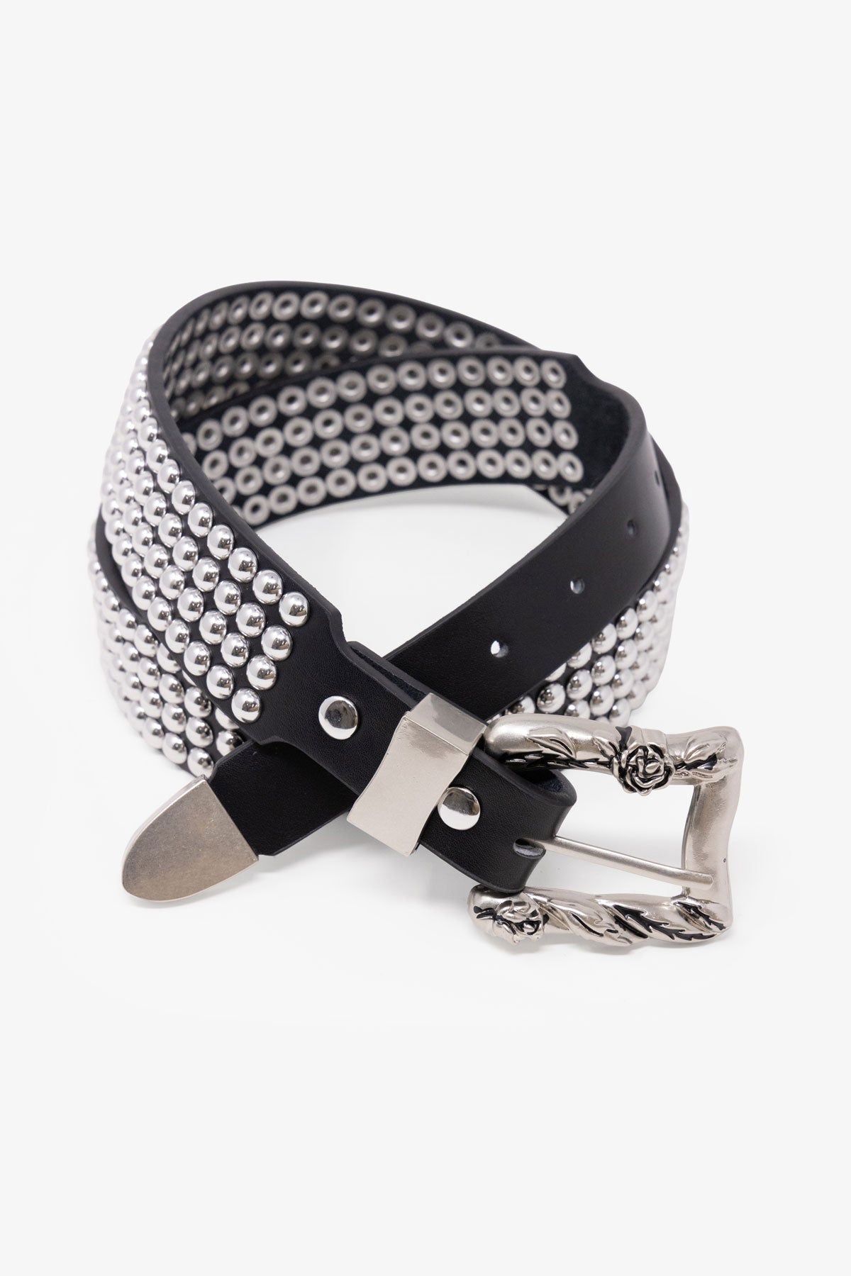 Constructed from 100% leather, the Vintage Studded Belt features a tapered point design with multiple rows of metal stud embellishments along the body. Finished with a square buckle detailed with sculpted floral accents, brushed metal hardware completes the piece with a worn-in appearance.