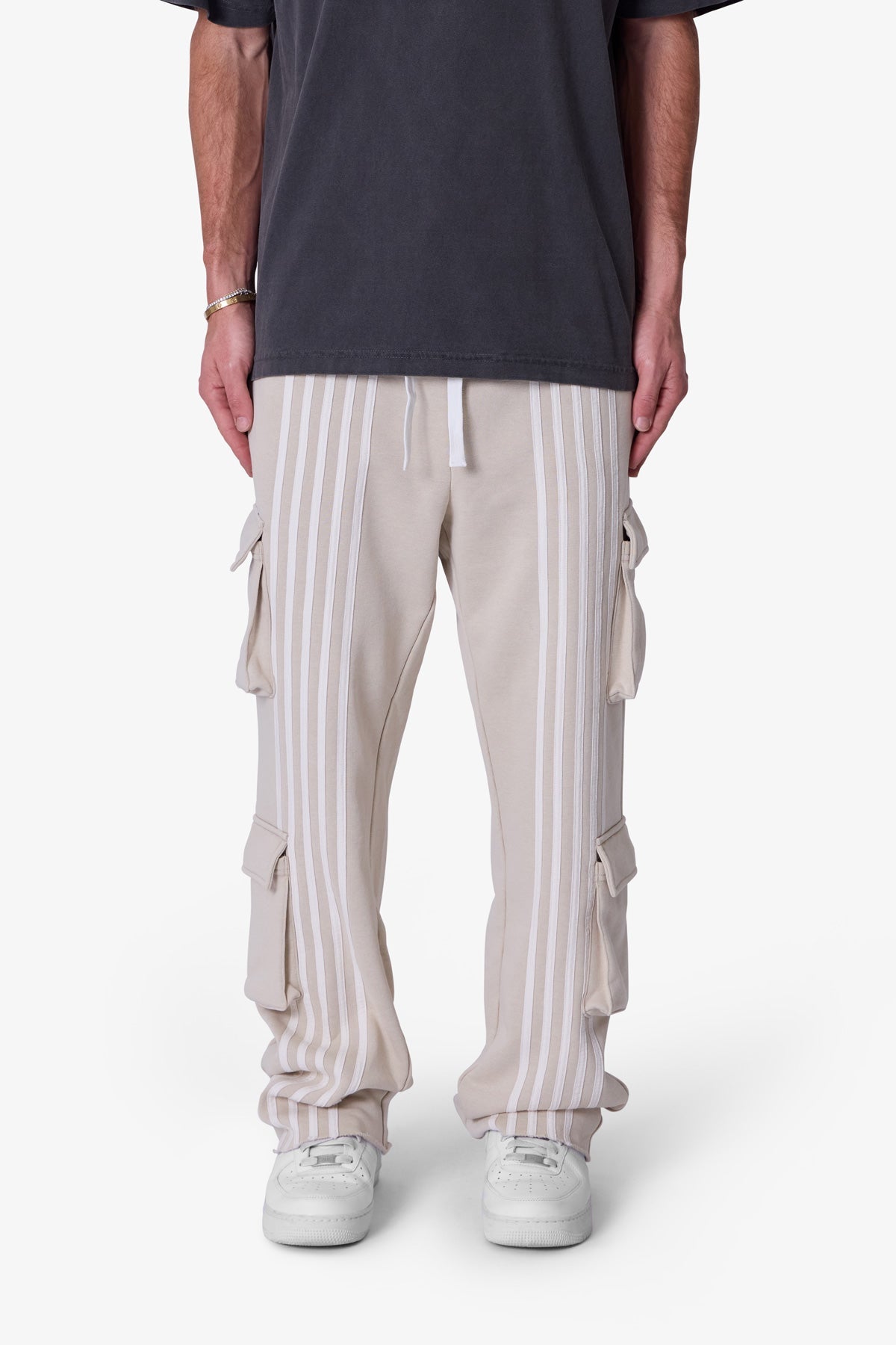 the Front Stripe Sweatpants are designed with a relaxed fit throughout with cargo pockets at the outseam, welt pockets at the hip, internal drawcord, contrasting taping stripe details down the front, and finishing off with a garment wash.