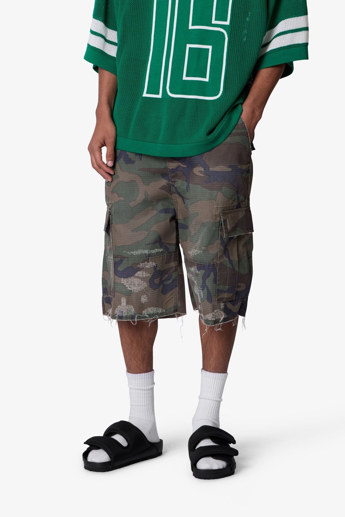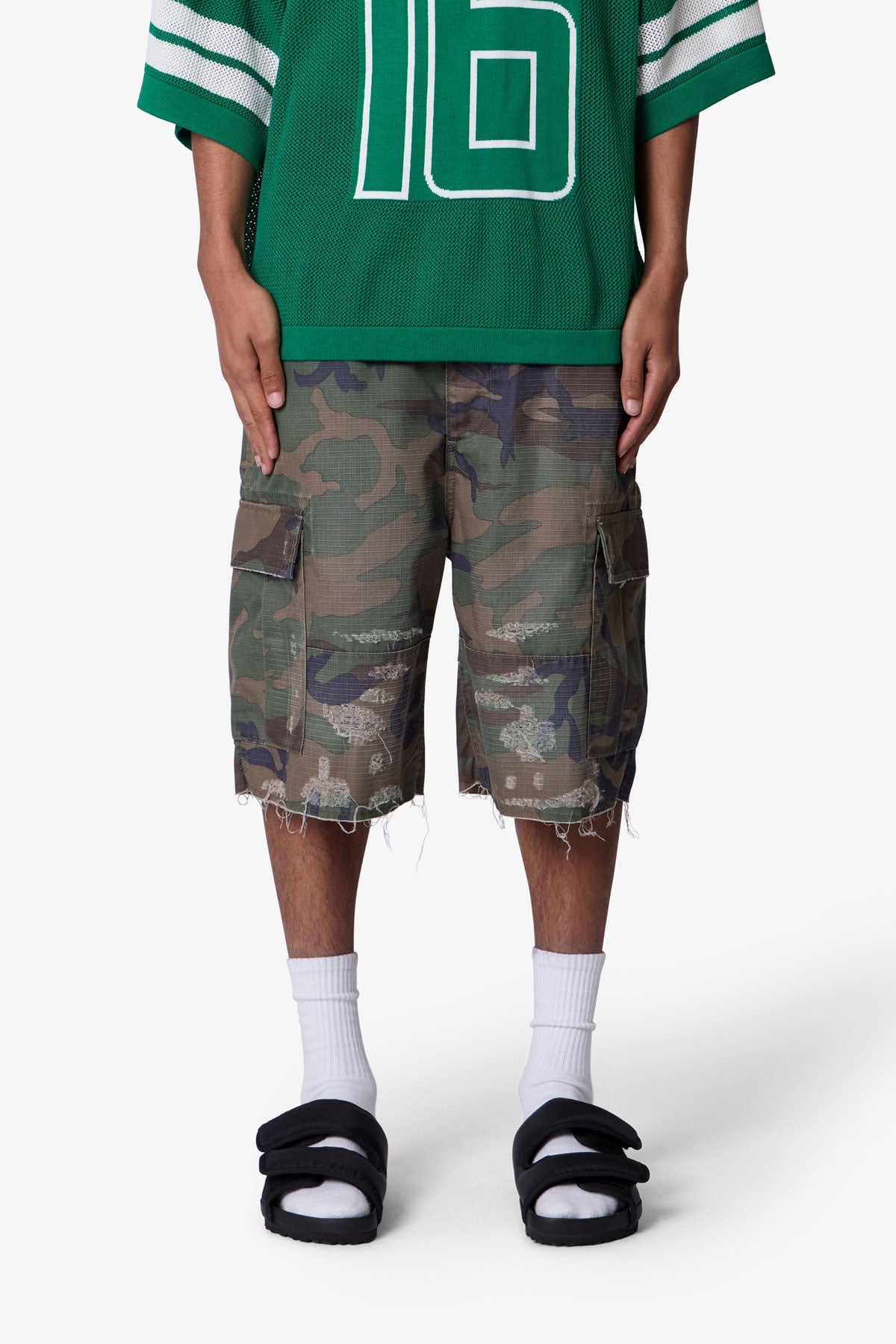 Constructed from a cotton-poly ripstop blend with a vintage wash, these shorts feature a baggy fit in a woodland camo print. Designed with heavy abrasion and faded detailing across the thighs, they include exposed threads at the raw cut hems for a deconstructed finish. Two large side cargo pockets with flap closures offer function and storage.