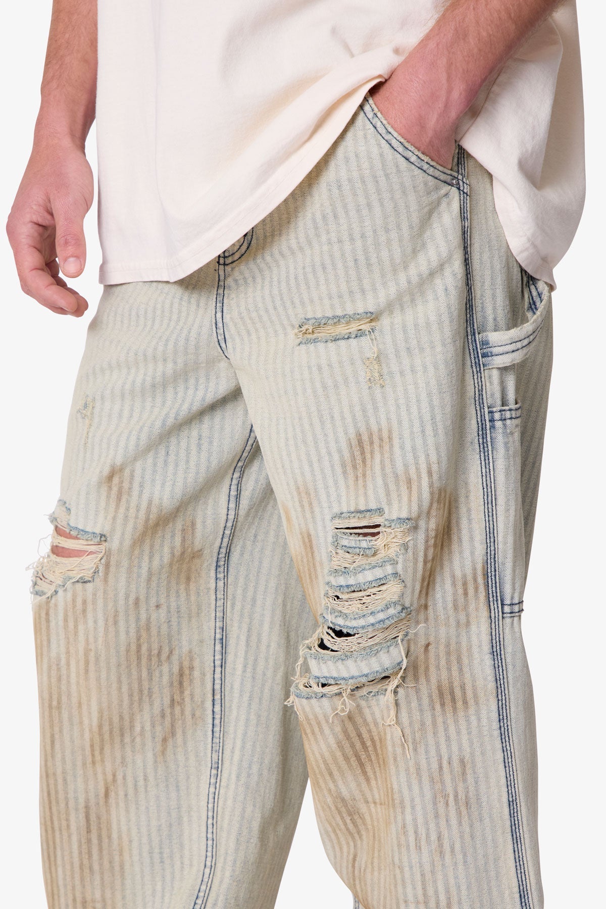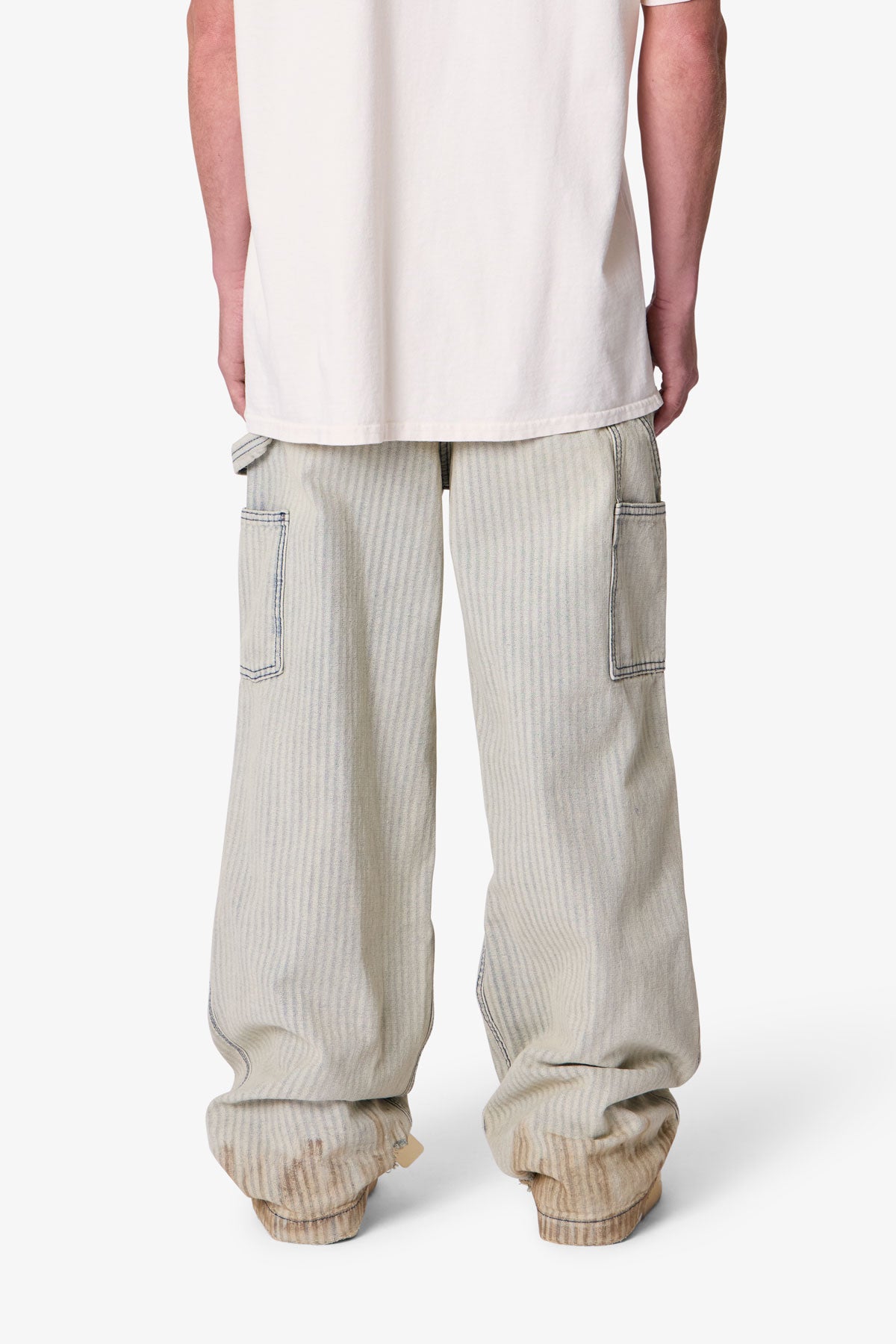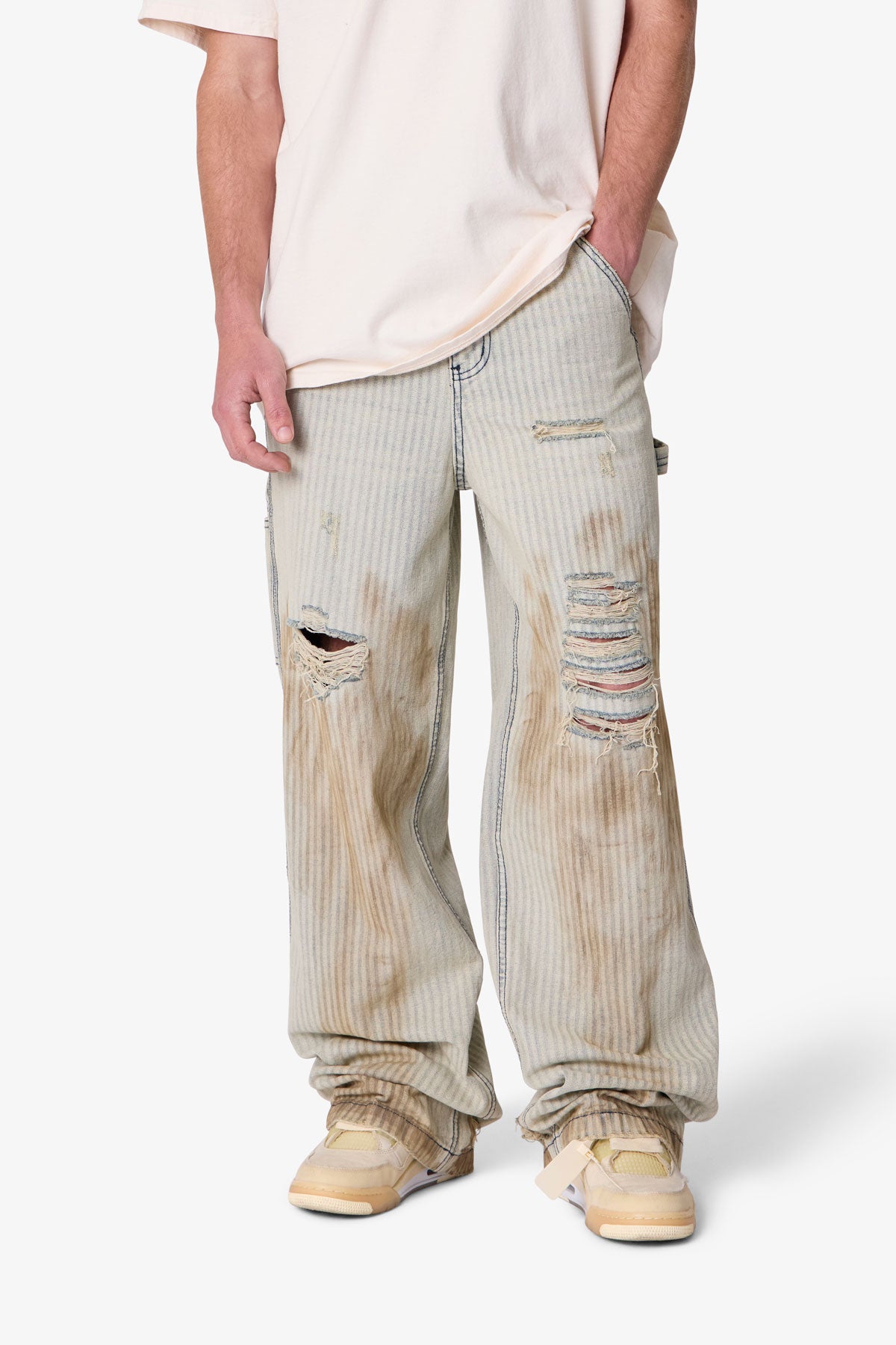 the Ultra Baggy Railroad Pants are designed with a new oversized ultra baggy fit, constructed from railroad denim with a vintage wash, featuring standard five pocket denim details, PP spray and staining for a true vintage look, distressing details throughout and finished with a button placket.