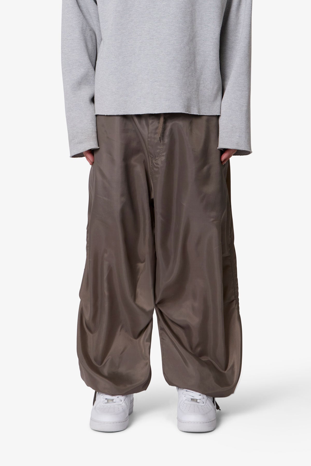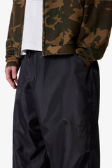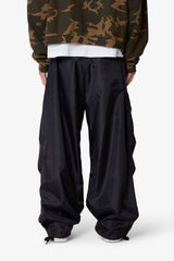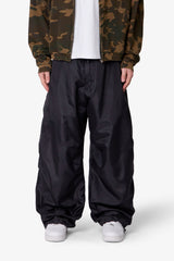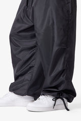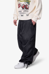Constructed from lightweight nylon, the Cinched Baggy Nylon Pants feature a wide silhouette with an adjustable drawcord waist and snap button closure. Designed with cinchable leg openings, a large back cargo pocket, and side seam pockets for utility-focused storage.
