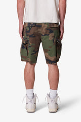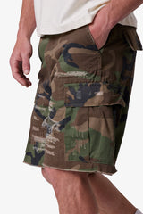 the Distressed Cargo Shorts are designed with a relaxed fit throughout, cargo pockets at the side seam, a button fly, and is finished with repaired distressing details throughout.