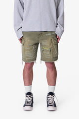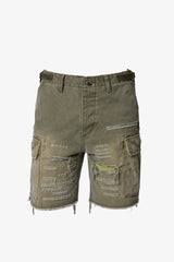 the Distressed Cargo Shorts are designed with a relaxed fit throughout, cargo pockets at the side seam, a button fly, and is finished with repaired distressing details throughout.