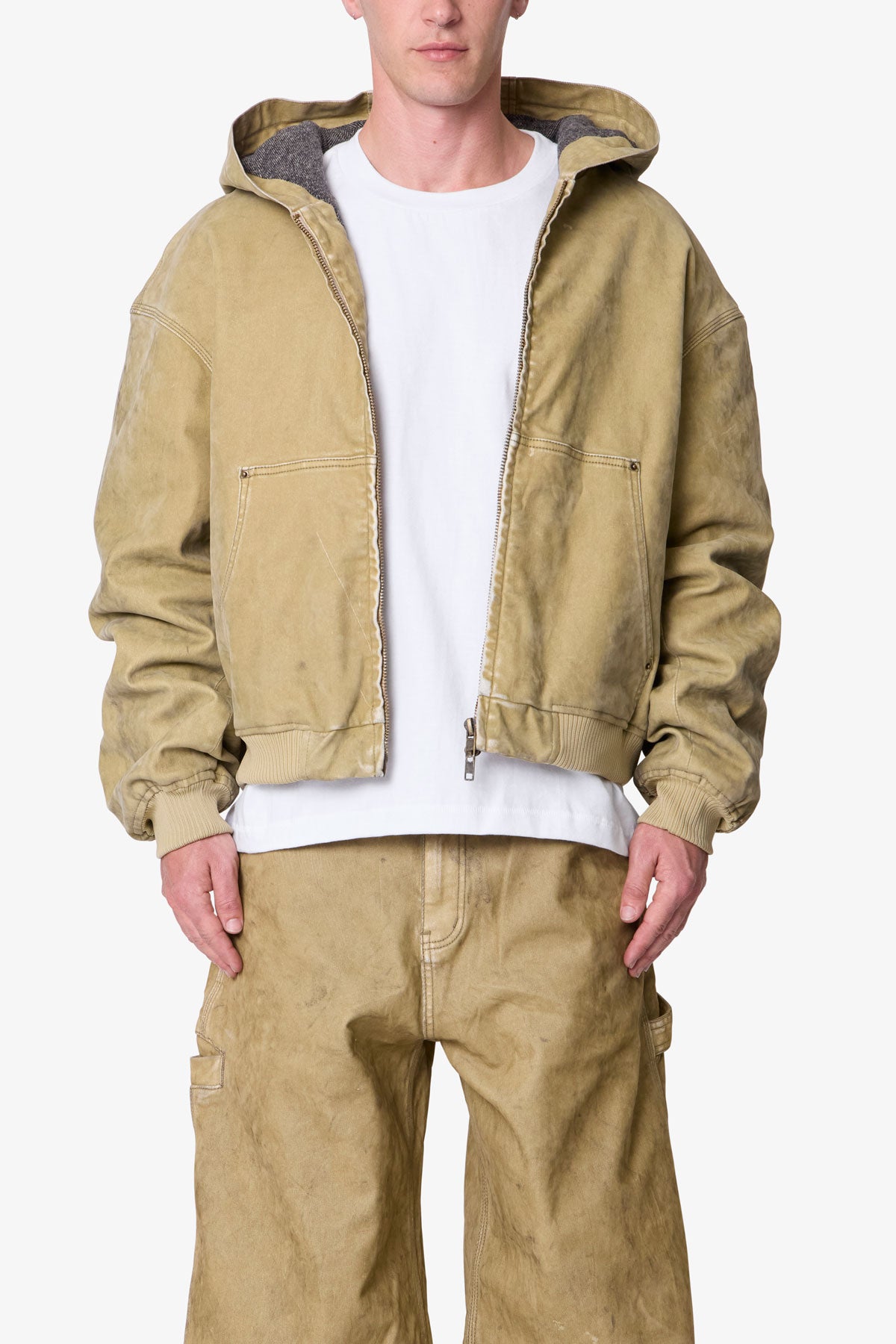 Constructed from heavyweight cotton with a small amount of stretch, the Flocked Oversized Work Pants feature a wide, ultra baggy fit. Designed with rivet detailing and a hammer loop, they utilize a durable flocked fabric with an oil wash treatment. Finished with classic workwear elements including slant front pockets and a five-pocket layout.