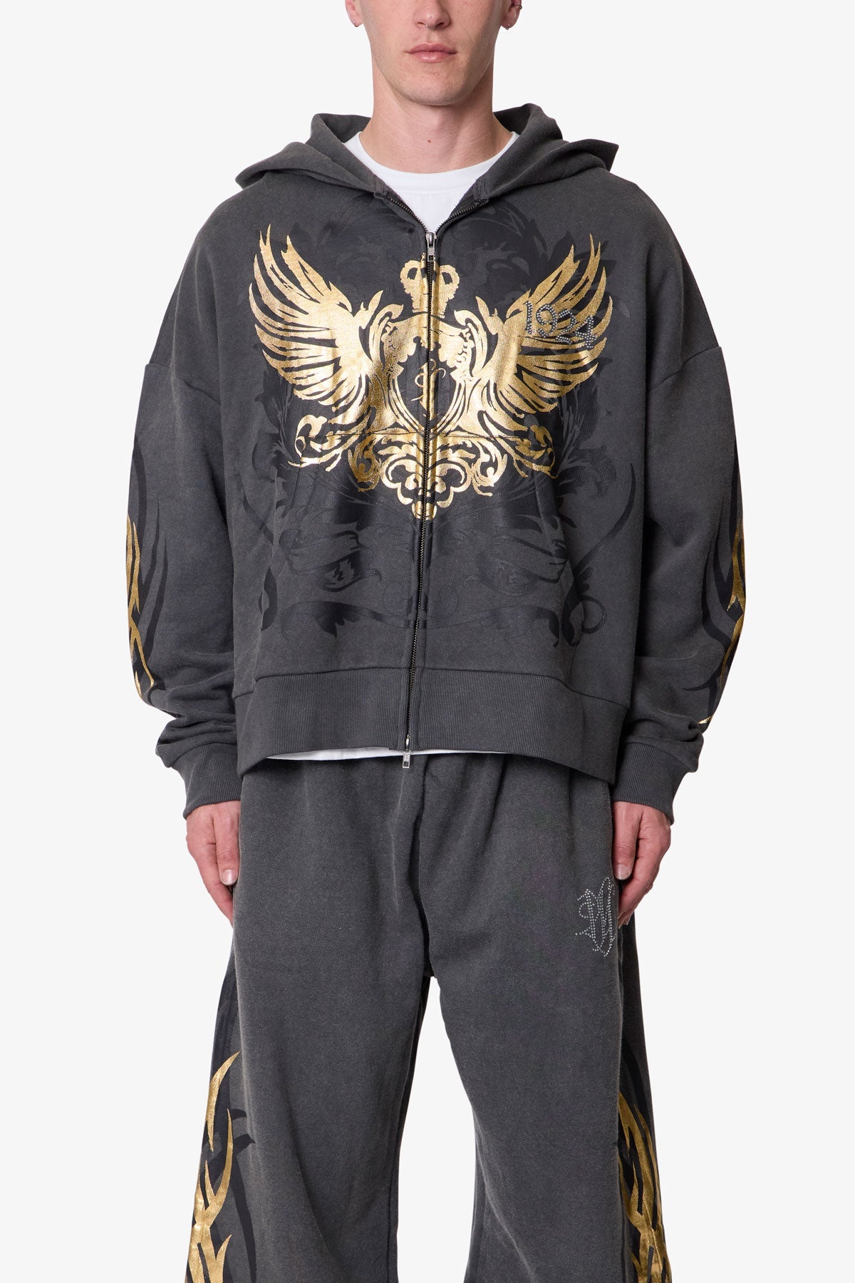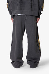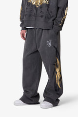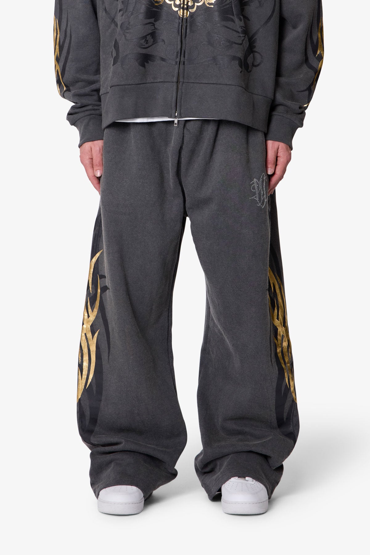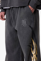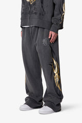 The Gold Foil Tribal Sweatpants are crafted from 100% cotton fleece with a weight of 380 gsm. These baggy-fit sweatpants feature an acid wash for a worn look and feel. The design includes a screen-printed Y2K-inspired tribal pattern on the side legs, accented with contrasting metallic gold print and a rhinestone M applique at the left thigh.