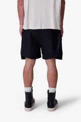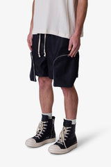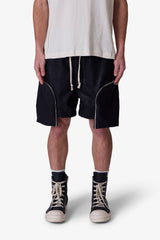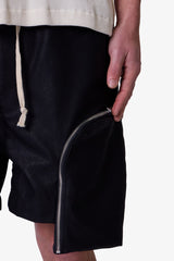the Leather Pocket Geo Shorts are constructed from a faux leather fabric in a baggy fit. The shorts feature an elasticized waist, welt pockets, exaggerated zipper pockets that extend past the leg opening with grommet details, and finished with a contrasting cotton drawcords.