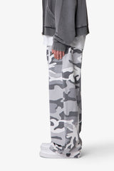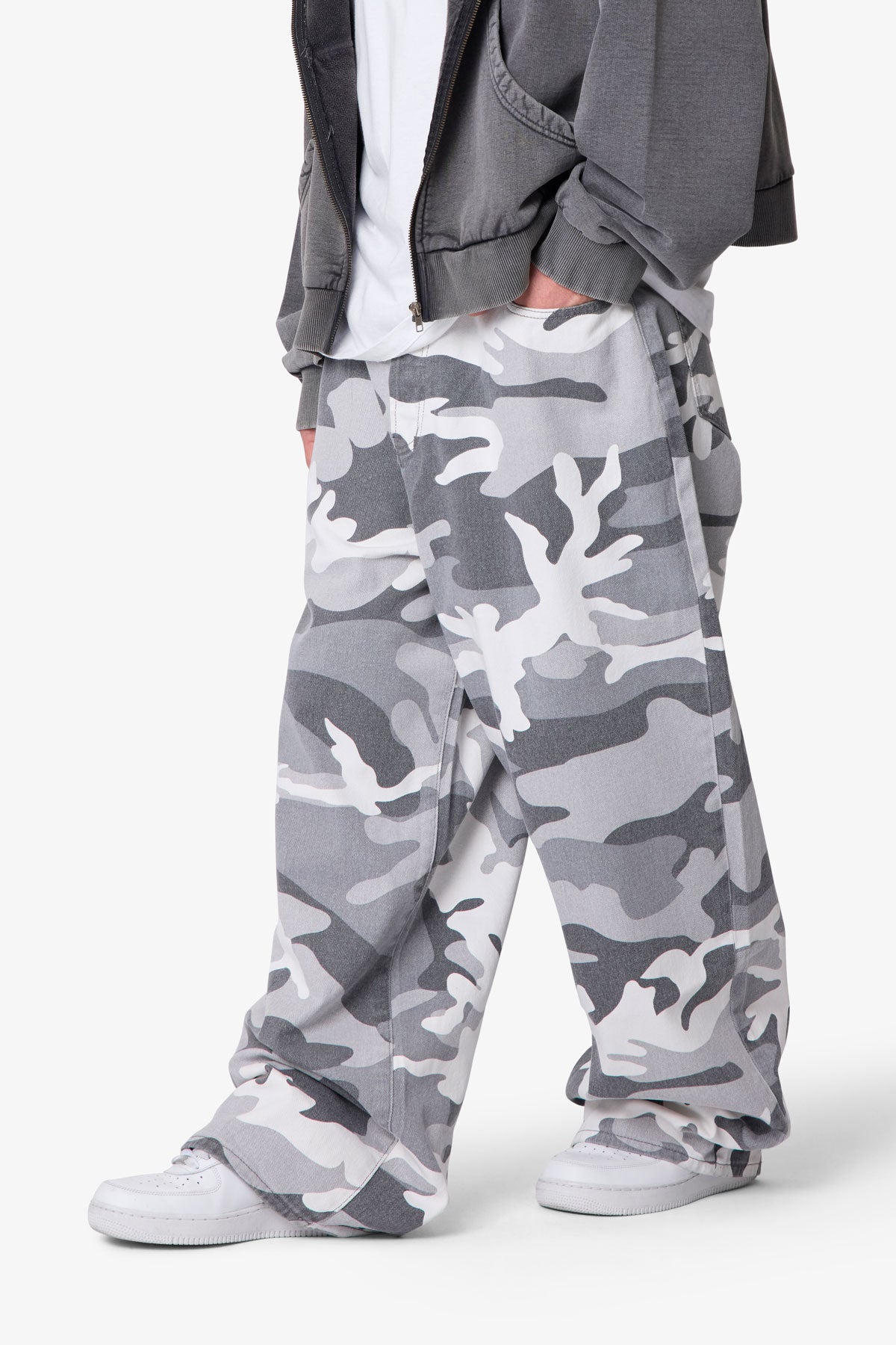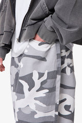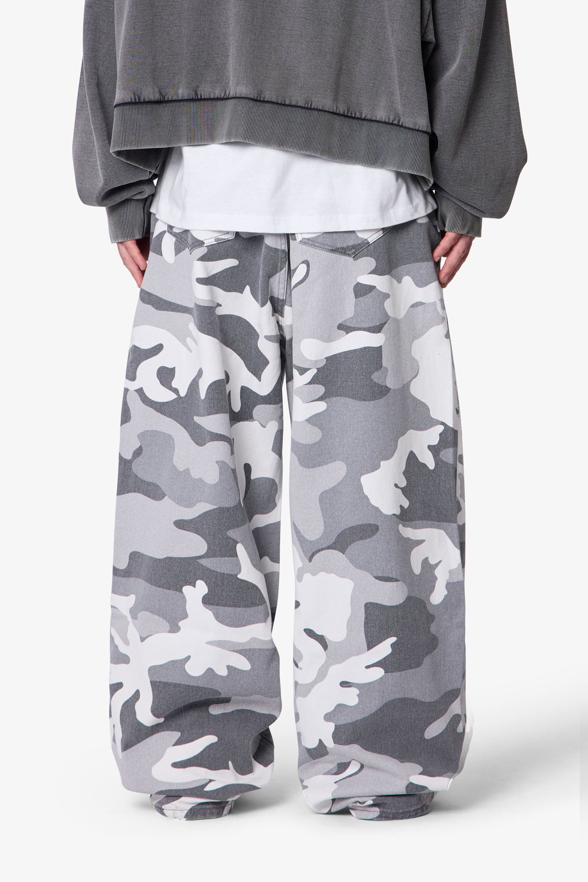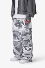 The Mega Baggy Pants feature a wide-leg silhouette in 100% cotton denim with a stone wash finish. Designed with an allover snow camo print, they include an internal drawcord at the waistband for adjustability. Finished with standard 5-pocket styling, button fly, belt loops, and a clean hem.