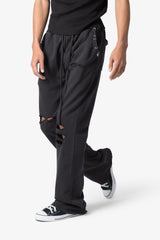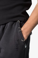the Metal Ring Flared Sweatpants are designed with a relaxed, flared fit throughout, featuring an elasticized self waist, garment washed for improved hand feel, distressing details throughout, extended tonal drawcords, and finished with metal ring details at the pocket opening.