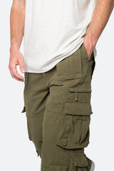 the Military Cargo Pants are designed with a relaxed fit throughout, with cargo pockets located on the outseam, including both traditional flap and zipper pockets, panelling at the knees, and finished with a vintage wash.