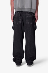 the Oil Stretch Cargo Pants are designed with a new oversized ultra baggy fit, constructed from a stretch cotton with a black tinted oil wash, featuring cargo pockets throughout with snap closures, and finished with a button placket.