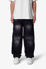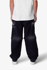 the Oversized Cargo Pants are designed with a new exaggerated oversized fit, constructed from a cotton ripstop fabric with a rinse wash, pp spray at the knees and thighs, tonal drawcord, cargo pockets throughout, and finished with an exaggerated waist that is intentionally large that allows for the waist to cinch for a custom fit.