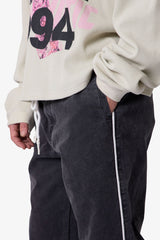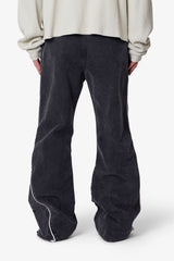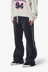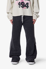 The Piped Kick Flare Pants feature a bootcut design with a kick flare fit. Constructed from 100% cotton denim with a black stone wash, these pants offer a roomy fit through the thigh and knee, leading to a super wide bottom opening for a pronounced silhouette. The contrast piped side seams and asymmetrical paneled legs add distinct visual elements, while the included shoelace belt enhances the overall design.