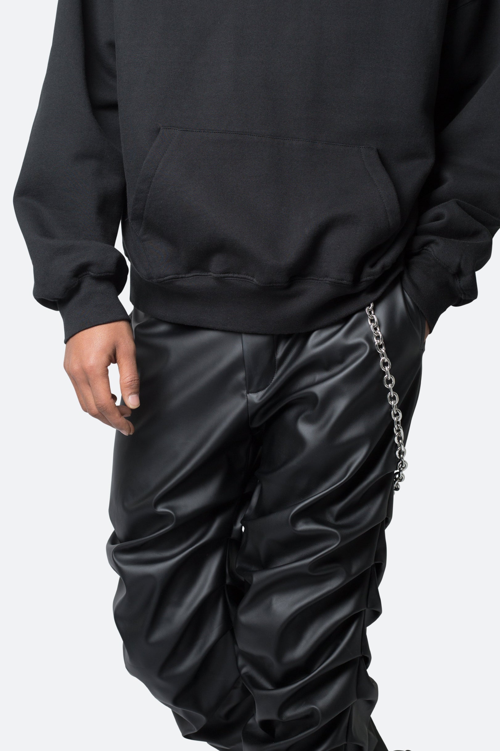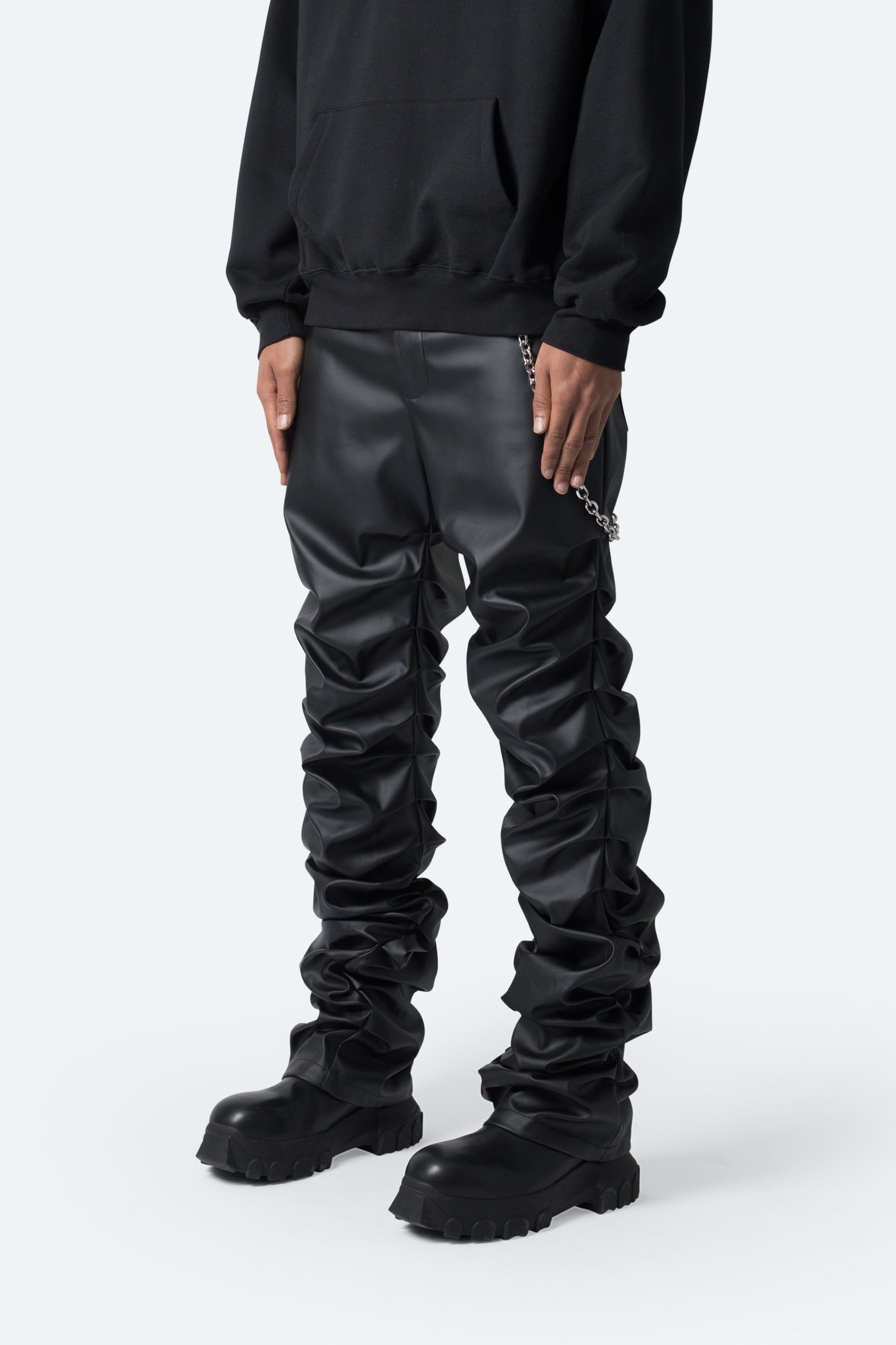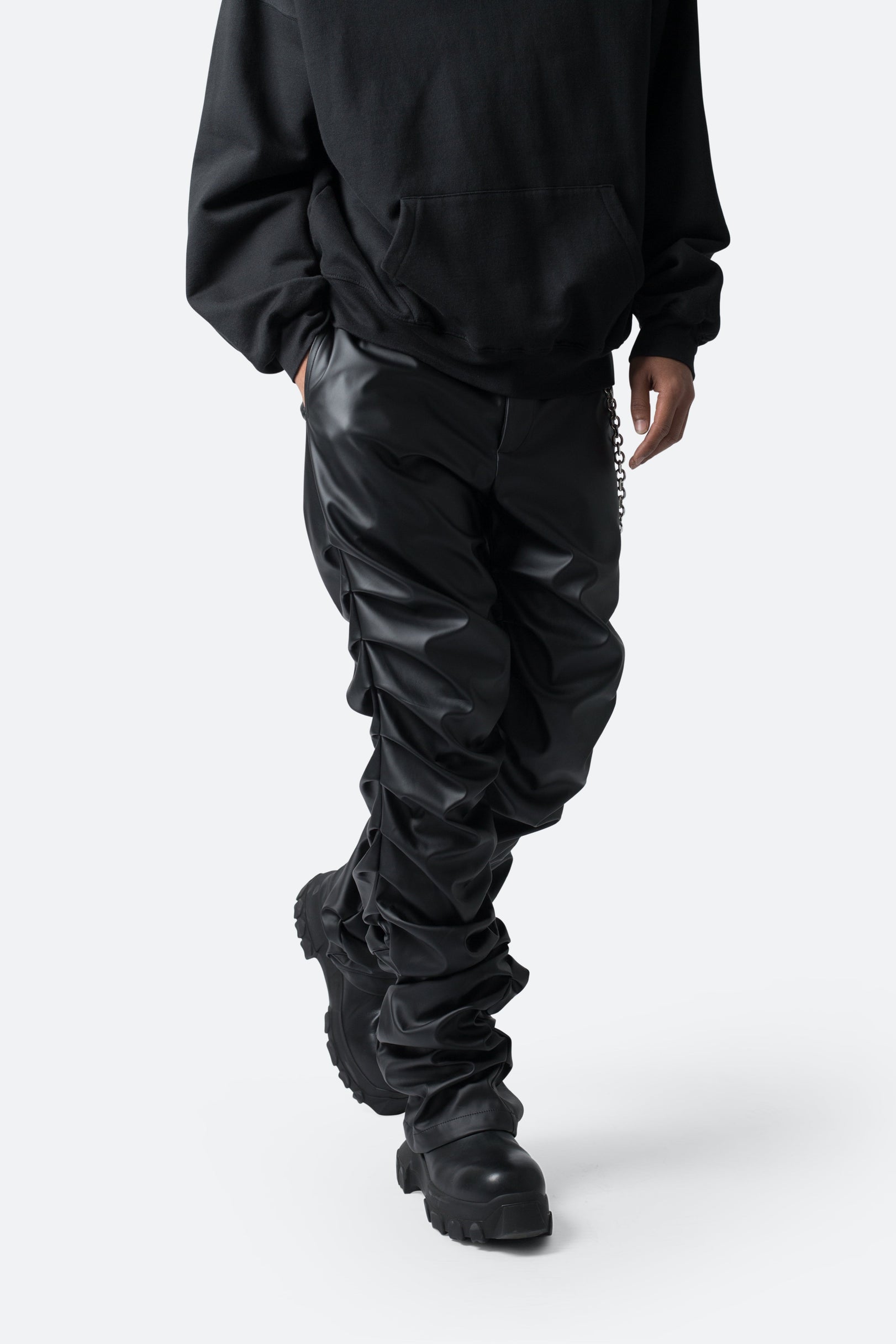 the Stacked Leather Pants are designed with a relaxed, straight, fit throughout, constructed from a custom developed poly leather, and finished stacked ruching details at the outseam for a stacked appearance.