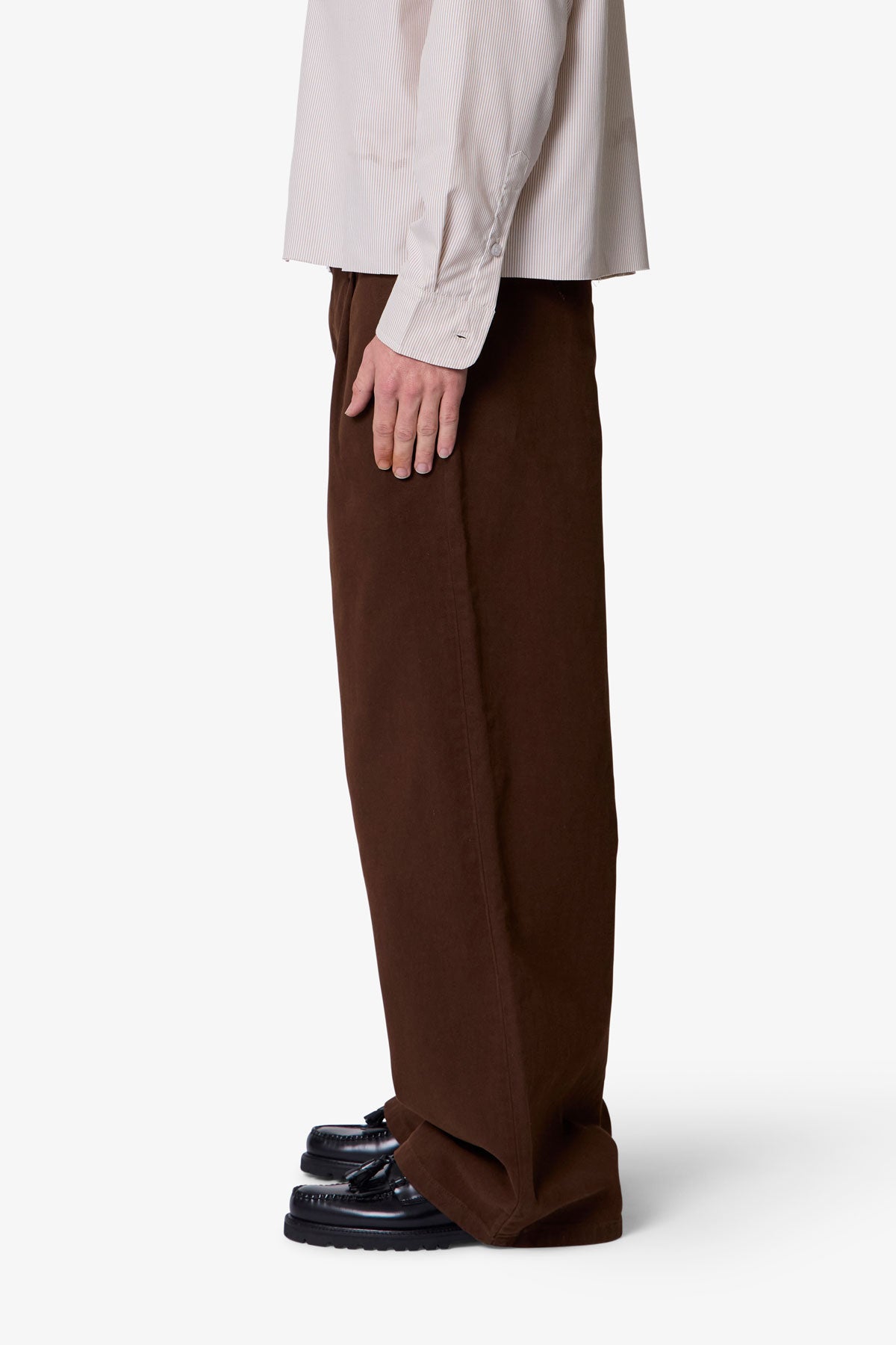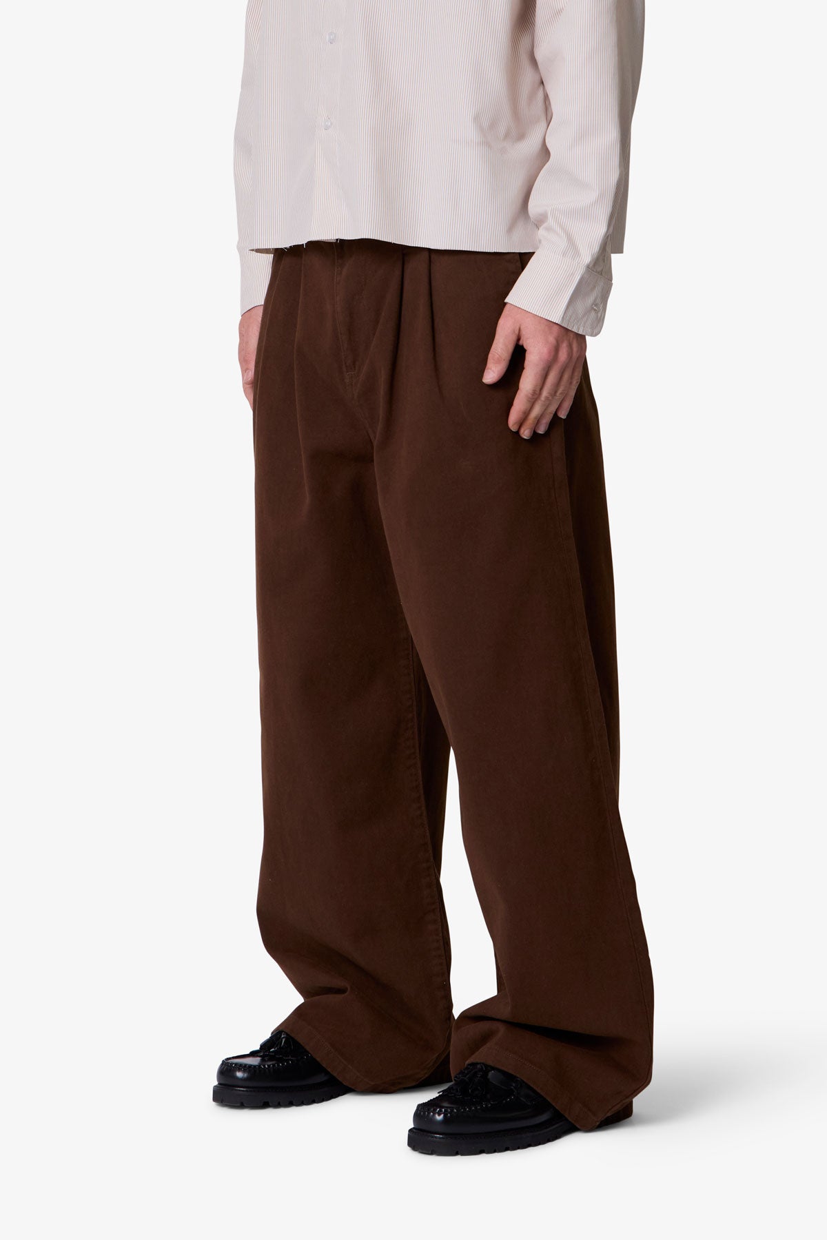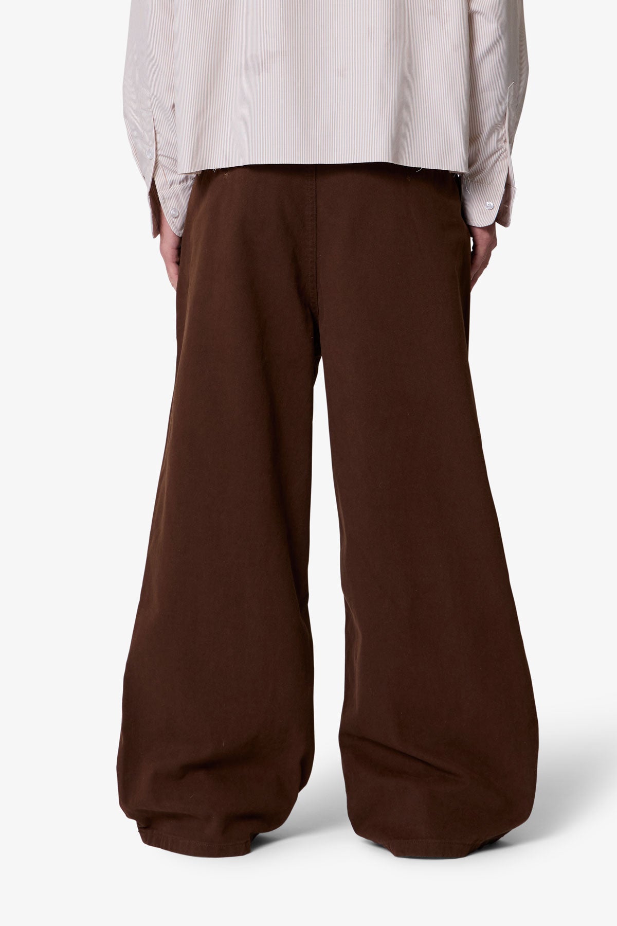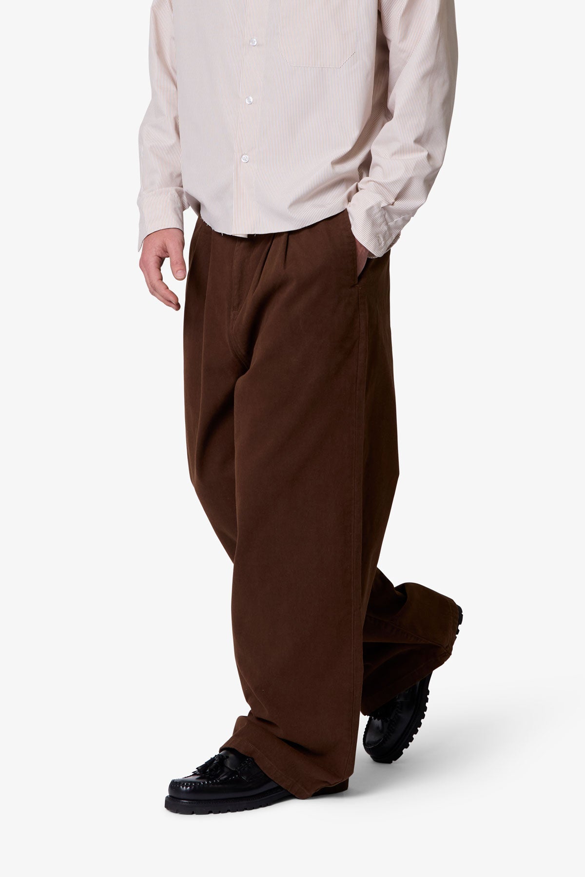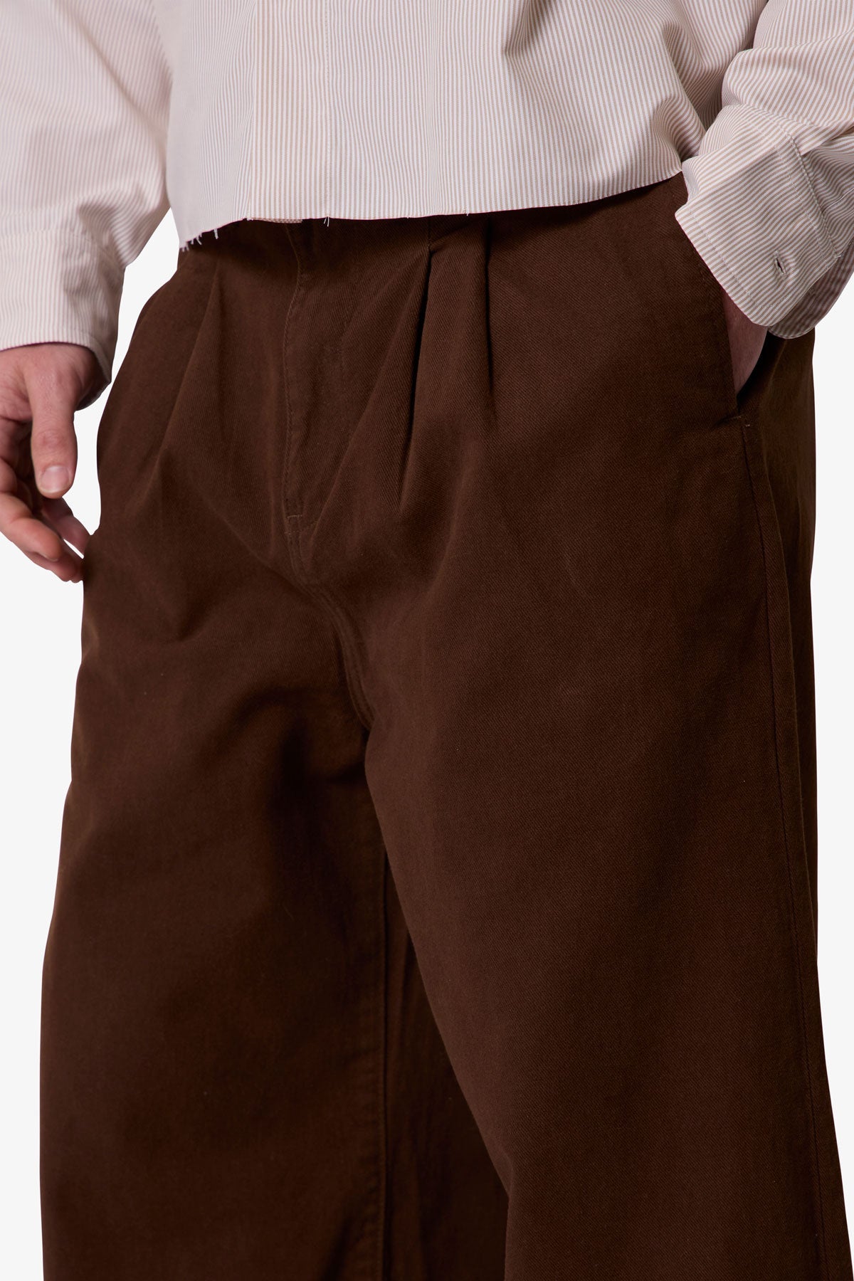 Constructed from 100% cotton twill with a vintage wash, the Twill Barrel Trouser features a wide barrel silhouette and a worn-in look and feel. Designed with a standard waist and baggy fit, it includes a button and zipper fly, belt loops, and finished hems. The back is completed with buttoned welt pockets.