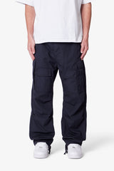 the Ultra Baggy Cargo Pants are designed with a new oversized ultra baggy fit, constructed from a ripstop fabric with a rinse wash, featuring cargo pockets throughout with snap closures, and finished with a button placket.