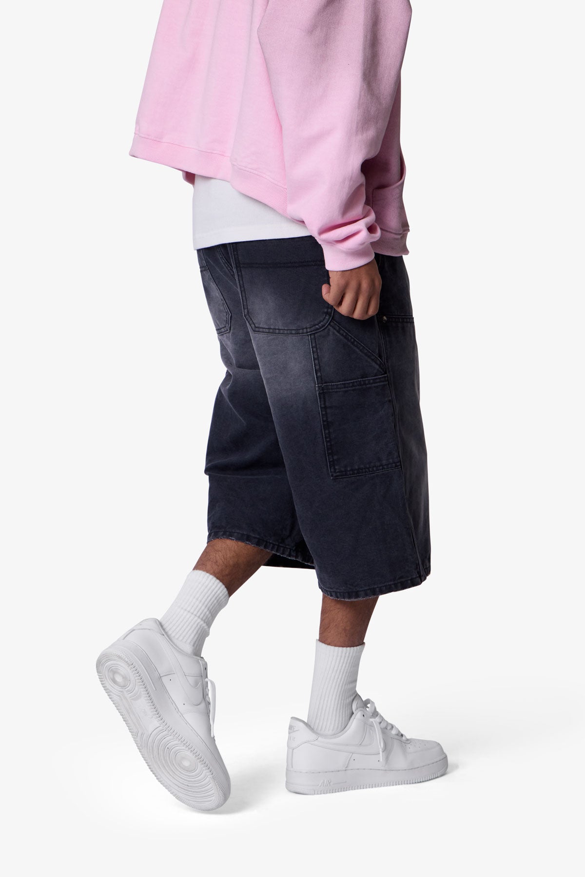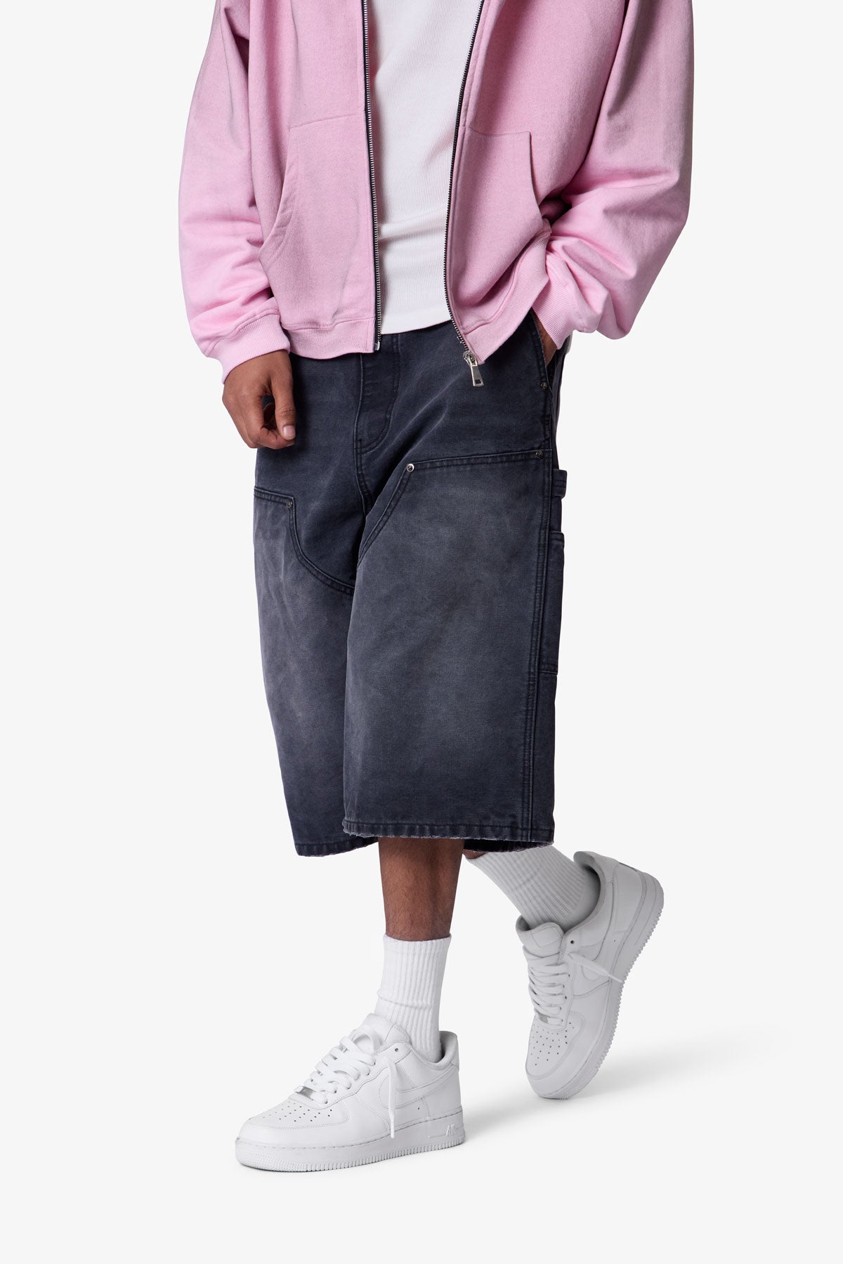Constructed from a cotton-poly blend denim with a vintage black wash, these shorts feature a heavily treated surface with black PP spray for a vintage patina. Designed with a wide leg and exaggerated baggy fit, they include reinforced double knee panels and multiple functional pockets. Carpenter loop and workwear detailing emphasize utility, while riveted slant pockets and standard belt loops provide durability and structure. Finished with a front button fly.