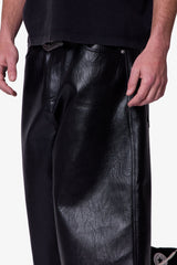 Constructed from textured faux leather, these shorts feature an ultra baggy fit with a wide leg silhouette. Designed with five pockets, standard belt loops, and finished with a front zip fly and button closure.