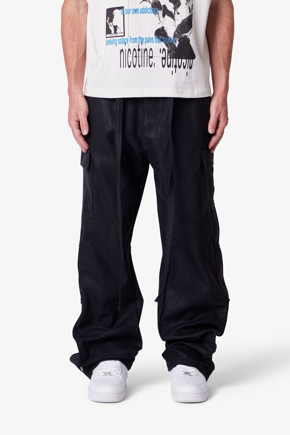 the Ultra Baggy Leather Snap Cargo Pants are designed with an oversized, baggy fit, constructed from a washed synthetic leather fabric, hidden snap closures on the cargo pockets throughout, snap details at the outseam, self fabric integrated belt, and finished with a zipper fly.