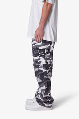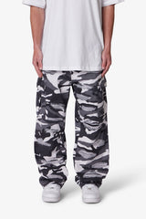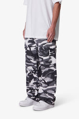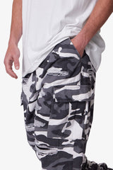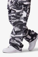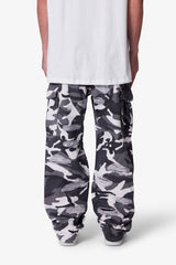the Ultra Baggy Skated Cargo Pants are designed with a new oversized ultra baggy fit, constructed from a urban camo printed denim with a rinse wash and distressing details throughout, featuring cargo pockets throughout with snap closures, and finished with a button placket.