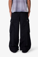 Constructed from 100% cotton denim, the Washed Cargo Pant features a baggy rave fit with a brown stone wash applied over a dark blue base. Designed with large flapped cargo pockets, flap detailing throughout, and a darted waistband for added dimension. Finished with a standard waistband, button fly, belt loops, and flapped back pockets.