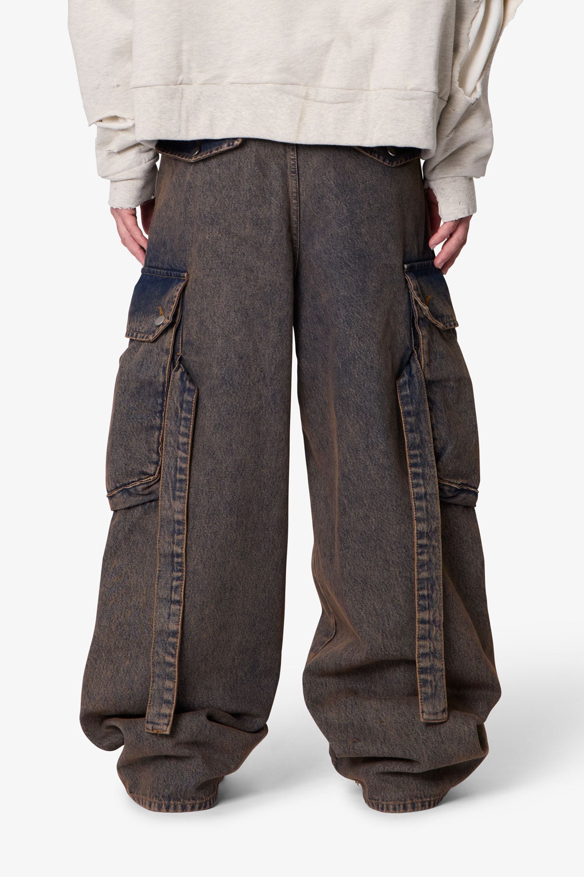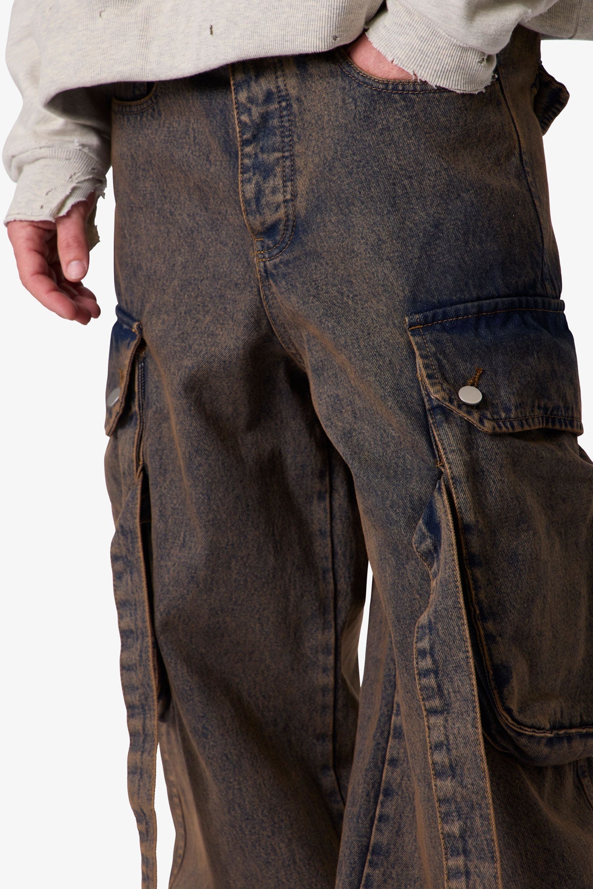 Constructed from 100% cotton denim, the Washed Cargo Pant features a baggy rave fit with a brown stone wash applied over a dark blue base. Designed with large flapped cargo pockets, flap detailing throughout, and a darted waistband for added dimension. Finished with a standard waistband, button fly, belt loops, and flapped back pockets.