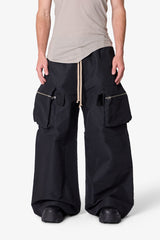 Constructed from 250 gsm polyester, the Zip Cargo Pocket Rave Pants feature a baggy silhouette with a long front and back rise. Designed with large zip-closure cargo pockets at the sides, panel detailing, and a flared opening, the pants are finished with an elastic waistband, elongated drawcord, and functional back flap pockets.