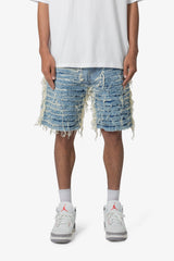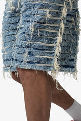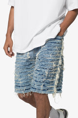 the Allover Frayed Denim Shorts are designed with a relaxed fit throughout, featuring a vintage wash, exposed and raw seams throughout, and finished off with raw hem.
