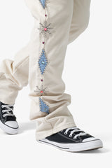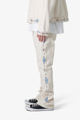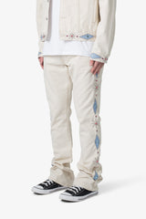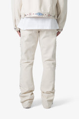 the B379 Studded Flare Denim are designed with our new B fit, which is relaxed through the thigh and features a slight flare at the leg opening and is constructed from a natural cotton colored denim, and finished with contrasting studding detail at the outseam and around the pockets.