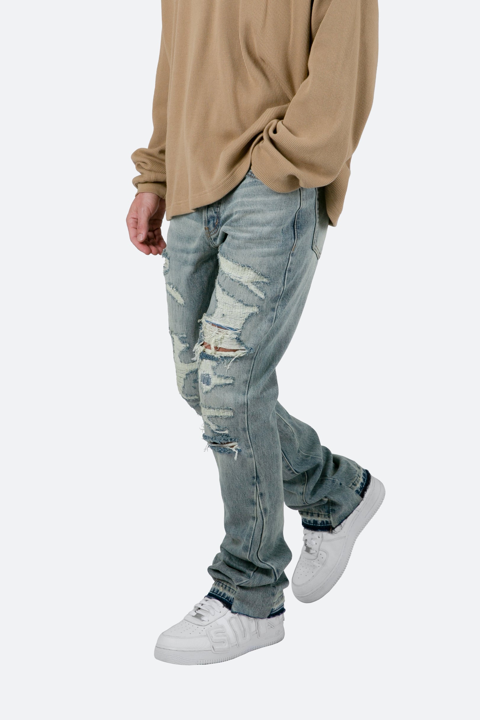 the B469 Flare Denim are designed with our new B fit, which is slim through the thigh and features a slight flare at the leg opening and is constructed from washed blue denim, panelling at the inseam and outseam from matching denim for a slight flare, distressing throughout, and finished with a deconstructed hem.