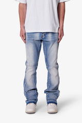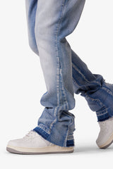 the B484 Flare Denim are designed with our new B fit, which is slim through the thigh and features a slight flare at the leg opening and is constructed from medium washed blue denim, panelling at the inseam and outseam from denim denim for a slight flare, distressing details at the back of the leg openings, and finished with a deconstructed hem.