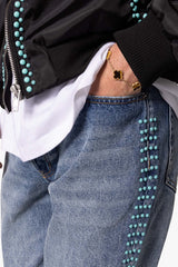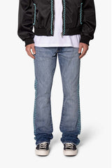 the B697 Turquoise Studded Flare Denim are designed with our new B fit, which is slim through the thigh and features a slight flare at the leg opening. Constructed from 100% Cotton, the turquoise studding along the out-seam makes a classic blue denim elevated.
