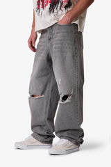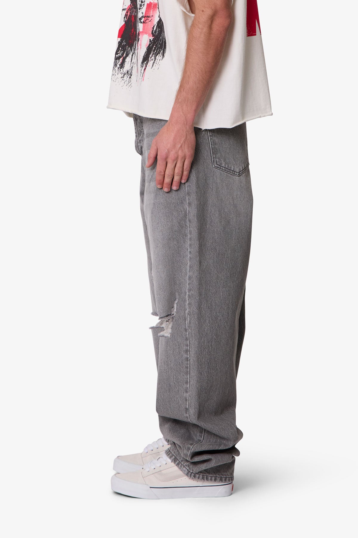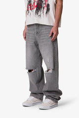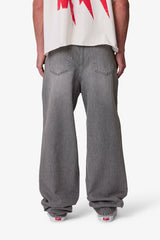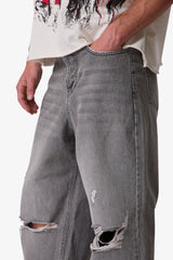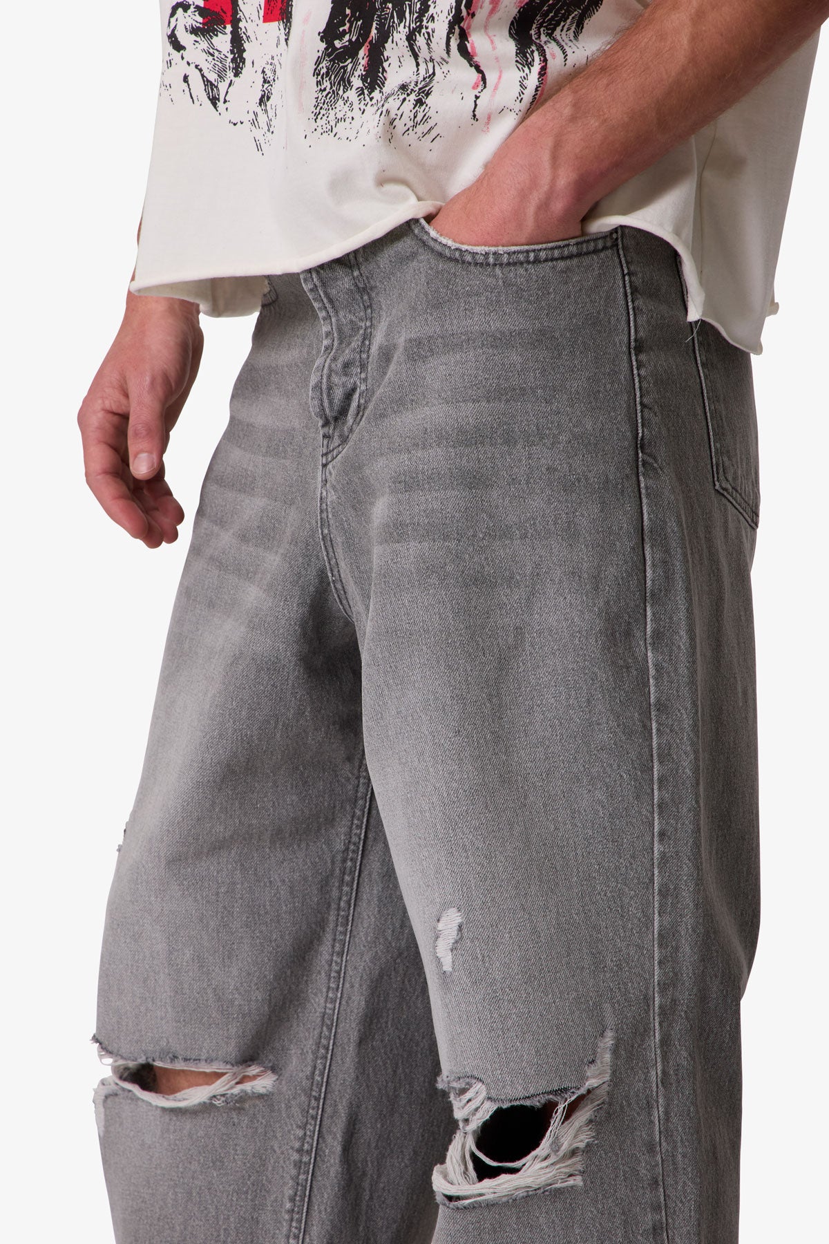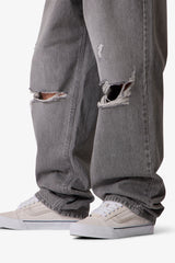 The Baggy Blowout Denim is constructed from cotton denim in a vintage black stone wash. Designed with a baggy fit, the jeans feature sanding and whiskering details across the front and back for a worn-in appearance. Two large knee blowouts provide added texture. Built with a longer rise, relaxed thigh, and wide leg silhouette. Finished with a classic five-pocket layout and traditional button fly.