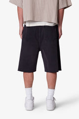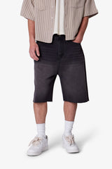 Constructed from an 89% cotton, 11% polyester blend, these knee-length denim shorts feature a baggy fit with a wide leg opening. Finished in a vintage black wash, they are detailed with subtle whiskering and fading across the front and back for a worn-in appearance. Designed with raw, straight cut hems and slight fraying. Includes a rear yoke with angled back pockets.