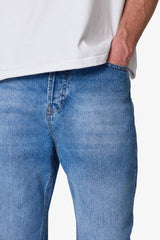 The Baggy Denim offers a relaxed fit throughout, providing enhanced comfort and a modern silhouette. Crafted from 100% cotton denim and featuring a medium blue vintage wash, this style includes subtle whiskering, sanding, and very light distressing for an updated look. Equipped with a traditional button fly and a standard five-pocket design, it is completed with standard belt loops for practicality.