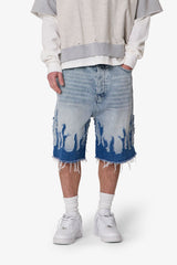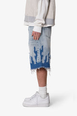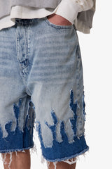 The Baggy Flame Denim Shorts are designed for a relaxed fit, constructed from 100% cotton with a vintage wash. These shorts feature a self-fabric flame applique, pp spray, and whiskering detail. Finished with a raw hem leg opening, they include standard belt loops, a button fly, and a classic five-pocket layout.