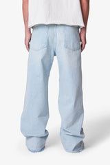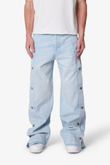 The Ultra Baggy Offset Button Denim is constructed from 100% cotton and features a relaxed, oversized fit. Designed with a faded wash at the thigh and knee areas for a worn-in look, it includes full-length shank buttons along the outer side seams. The buttons function from the knee down, allowing for adjustable leg openings. Finished with frayed raw hems and a classic five-pocket layout.