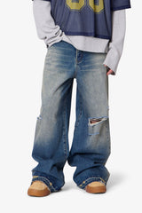 the Baggy Rave Denim are designed with a new oversized rave fit, constructed from a washed denim, distressing throughout, and finished with a deconstructed hem.