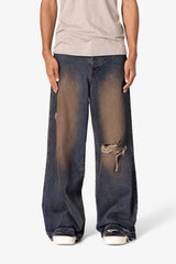 the Baggy Rave Denim are designed with a new oversized rave fit, constructed from a washed denim, distressing throughout, and finished with a deconstructed hem.
