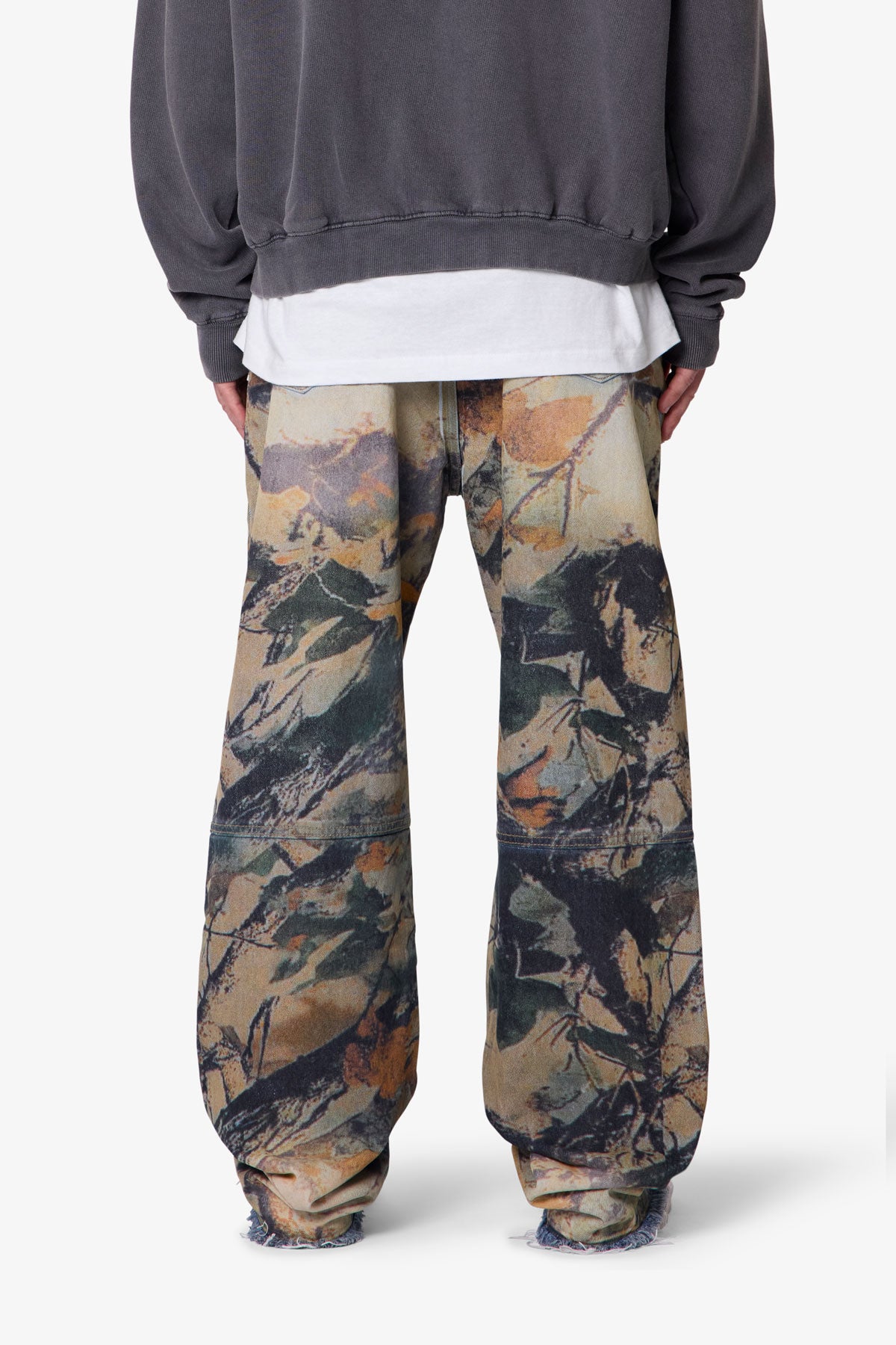 The Camo Printed Ultra Baggy Denim features a wide-leg silhouette with a light stone wash and all-over leaf camo print. Constructed from 100% cotton denim, the fit is oversized throughout with heavy sanding on the crotch, thigh, and bottom for a worn-in appearance. Finished with a standard waistband, belt loops, and a 5-pocket layout.
