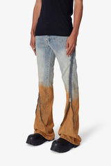 the D519 Zipper Flare Denim is designed with our D fit which is straight throughout, zipper detail extending from the thigh to the shin to provide a flare fit through the leg, and is constructed from light wash blue denim with a gradient wash from the leg opening.