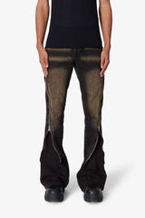the D519 Zipper Flare Denim is designed with our D fit which is straight throughout, zipper detail extending from the thigh to the shin to provide a flare fit through the leg, and is constructed from vintage washed black denim.