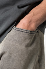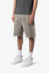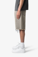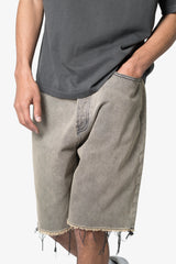 the Distressed Mineral Denim Shorts are designed with a relaxed fit throughout, featuring traditional five pocket denim details, raw hem at the leg opening, and finished with mineral wash.