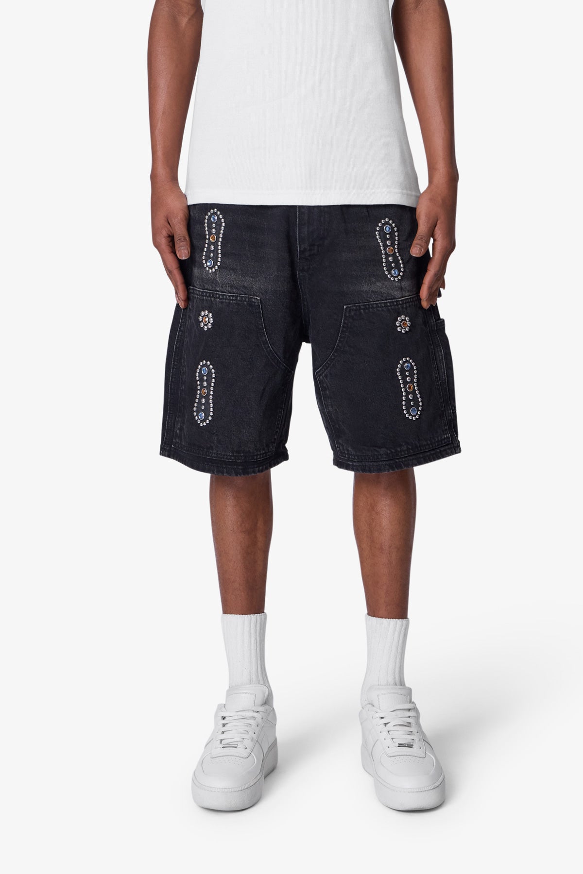 Constructed from 100% cotton denim with a medium blue wash, the Western Jewel Denim Shorts feature a baggy fit and are finished with western- and workwear-inspired detailing. Design elements include jewel and leather patch appliques, a studded applique patch, and a double knee construction. Functional features include a hammer loop, work pocket, and utilitarian panelling throughout.