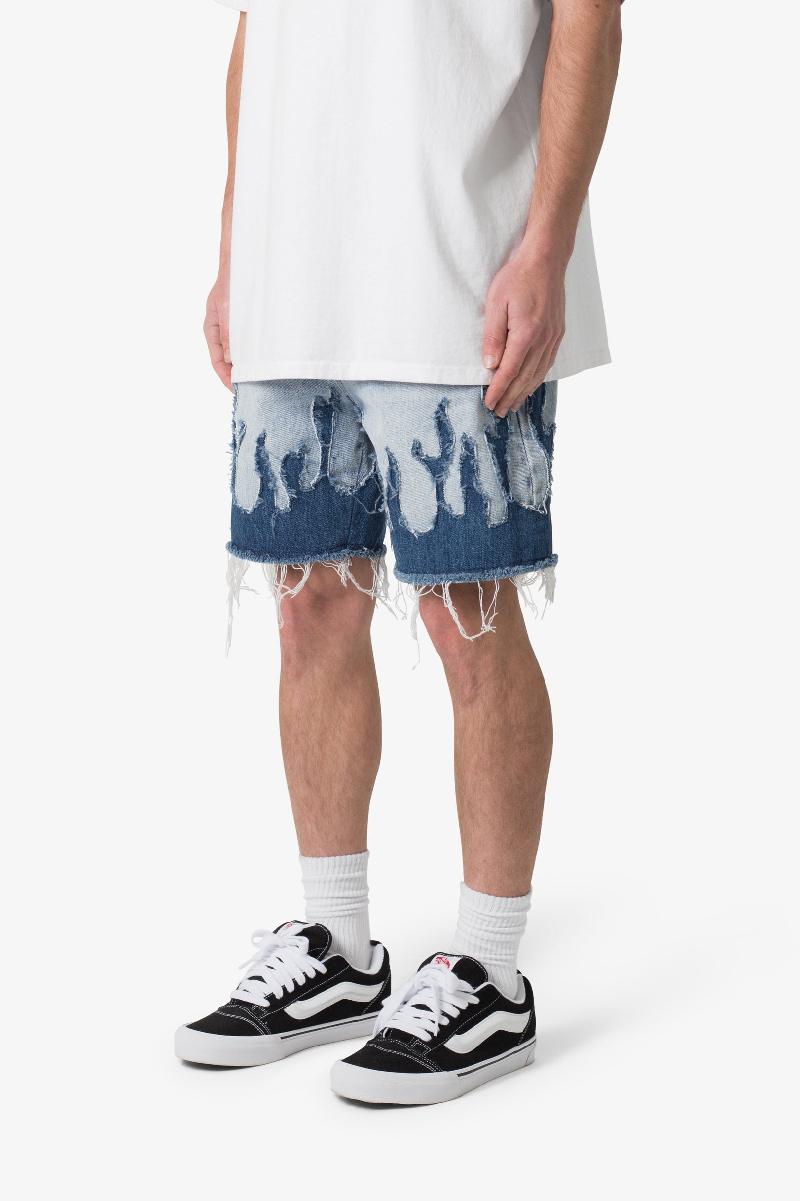 Introducing our Flame Denim Shorts, crafted from 100% cotton denim for ultimate comfort. These shorts feature a standard fit, ensuring a timeless silhouette. With intricate flame and dual-tone detailing, along with a distressed finish, they exude a bold and edgy style.