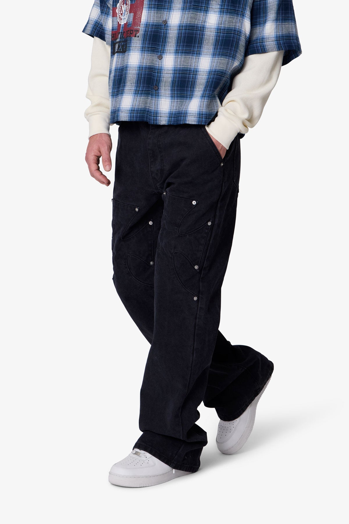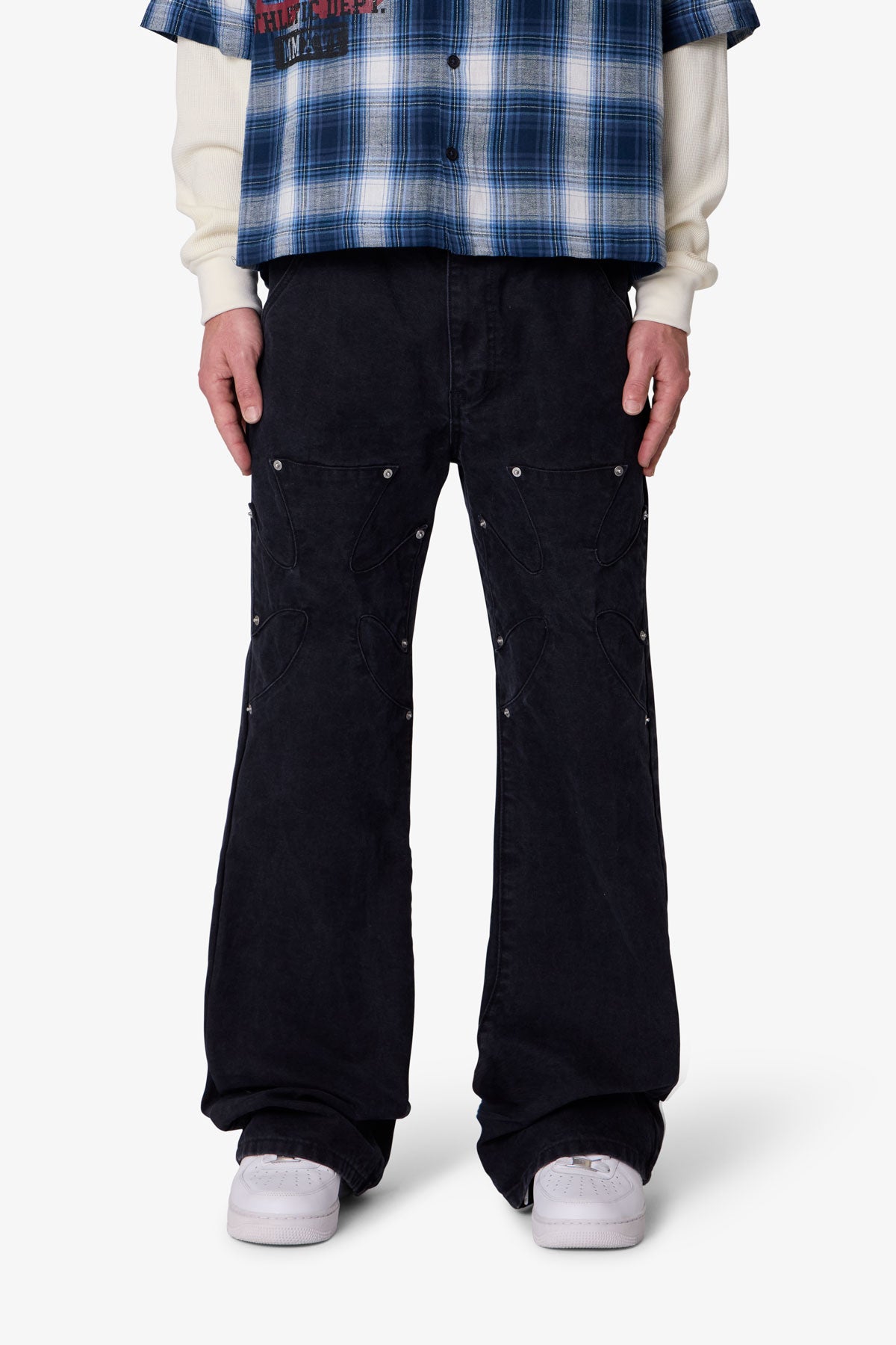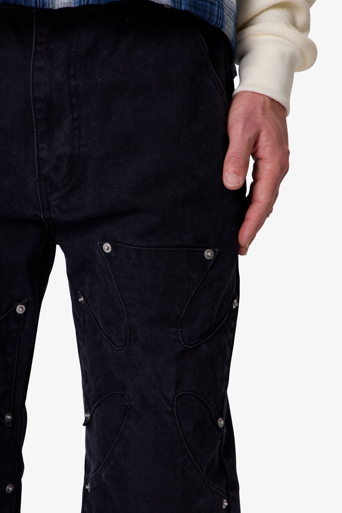 The Iron Cross Denim features a bootcut fit crafted from 100% cotton, providing durability and comfort. This style is enhanced with a self fabric applique, adding a distinctive design element. The fabric is treated with an enzyme wash for a clean finish.